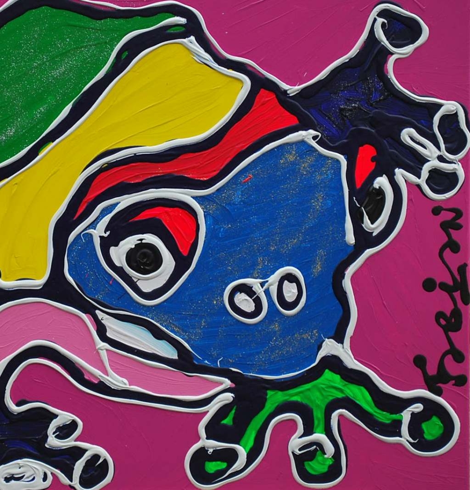 HIER IS ,,FABIAN "MET HET KUNSTWERK MET DE ,,FROG"EEN LIEFJEHEBBER STUK , EEN GROE/GELE GIFKIKKER , MET DIKKE LIJNEN ACRYL, DAT MAAKT DE KLEUREN PAKKET , AANTREKKELIJK IS VOOR EEN MOOI IN DE COBRA STIJL ONTWIKKELD KUNSTWERK