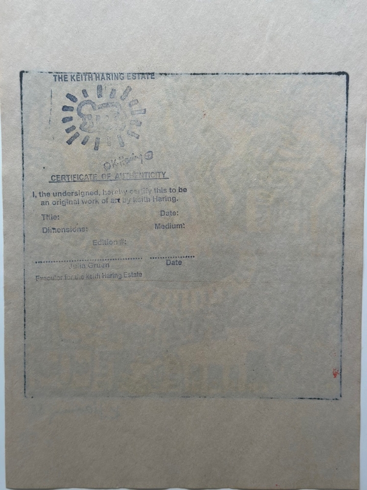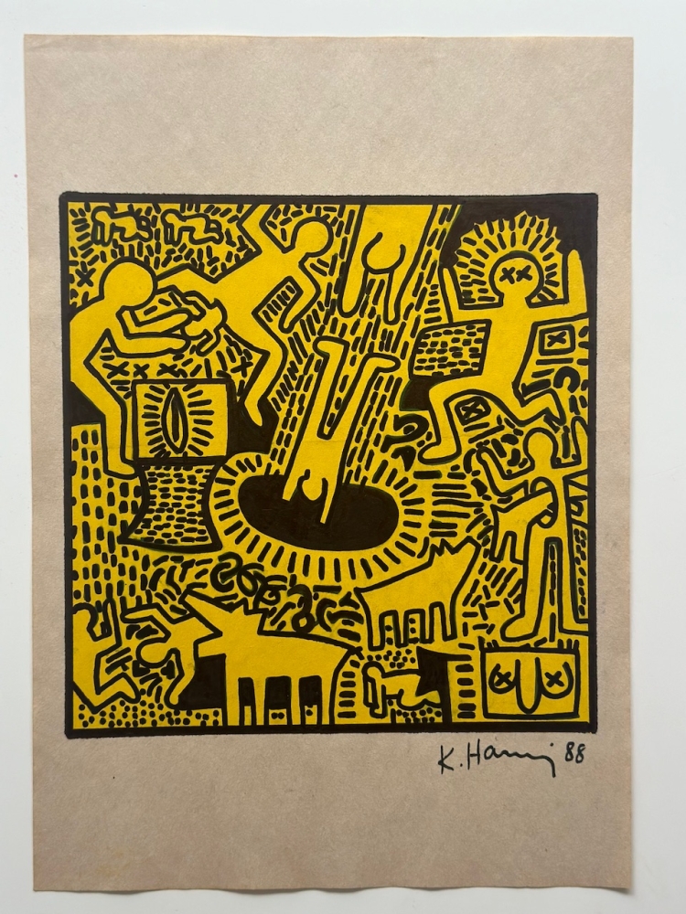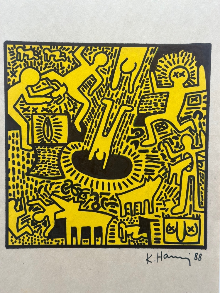 Originele tekening in stift met stempel op de keerzijde van de Keith Haring Estate Keith Haring was een Amerikaans kunstenaar. De kunst die Keith Haring maakte wordt soms popart genoemd, maar ook de termen graffiti-art en moderne kunst worden gebruikt. Zijn cartoonachtige schilderingen en tekeningen gingen onder andere over aids, drugs en apartheid