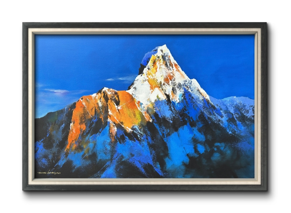 In this painting, I've captured the sublime essence of nature's majesty with vivid brush strokes in acrylic. The mountain peak bathed in the golden light of dawn contrasts against the cool, shadowy blues, invoking a sense of serenity and awe. The oriental art style influences offer a sense of harmony and balance. Each stroke is infused with my passion for realism and the tangible beauty of the outdoors. This piece is designed to radiate a tranquil yet vibrant energy, bringing the splendor of the natural world into your space.