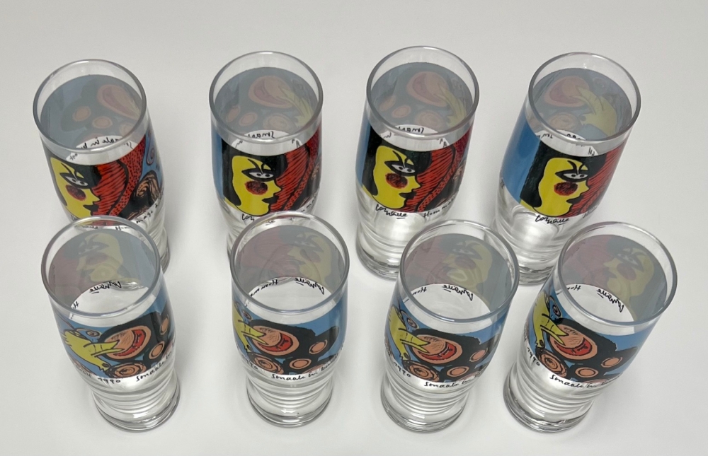 Lot de 10 verres : "Hommage à Van Gogh " 1990 13 cm de Hauteur x 7 cm . Sérigraphies sur verres signées dans la planche. Joli bleu du ciel avec les astres (soleil-lune). Rétrospective Corneille en Belgique en 2024