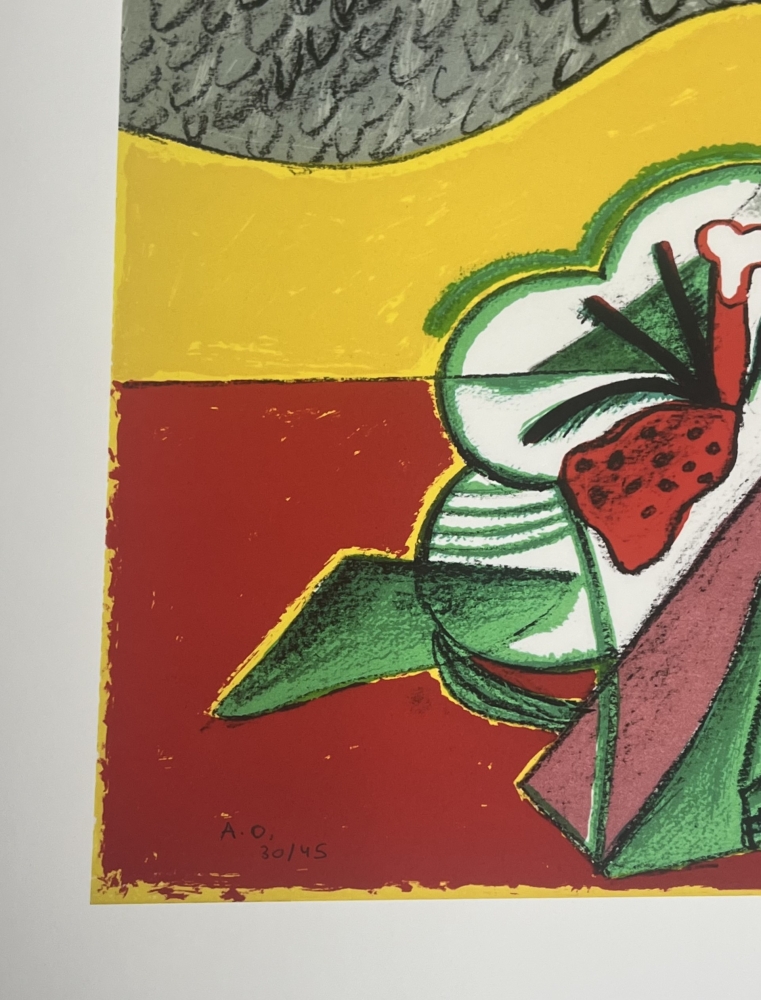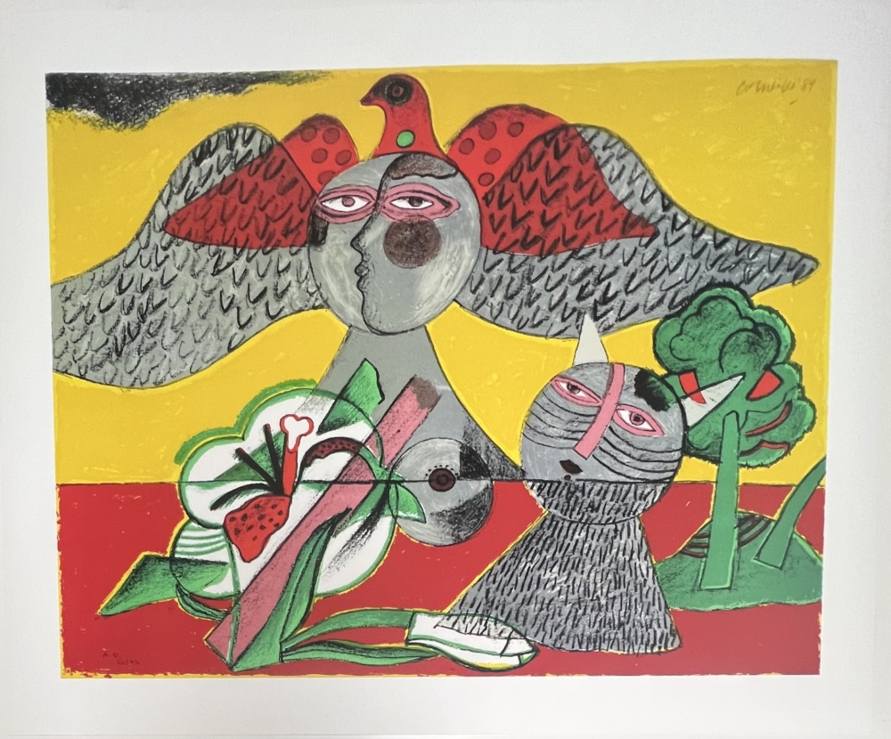 Oeuvre de 1984 de Guillaume Corneille, jouant ici sur de belles oppositions de couleurs proches de peintres coloristes tels que Gauguin ou Matisse. Réédition autorisée à 45 exemplaires d'après la lithographie originale. Tirage numéroté. Timbre à sec des éditions et tampon au dos : Archives officielles Guillaume Corneille / Schana B Editions Dimensions totales : 51,5 x 66 cm. Parfait état. Impression sur papier vélin Belge (chanvre) avec les pigments naturels de la lithographie. Guillaume Corneille fut l'un des membres fondateurs du groupe Cobra avec Karel Appel, Asger Jorn, Christian Dotremont, Constant, Jacques Doucet, ou Alechinsky.