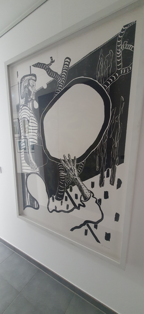 Grande gravure sur bois en noir et blanc (en 4 parties) dans un cadre. L'uvre est encadrée de plexy et d'un cadre blanc. Dimensions de la gravure sur bois : 1420 x 1020 mm. Dimensions du plateau : 1540 x 1130 mm. L'uvre est signée et numérotée 25/30. L'uvre est décrite dans l'uvre graphique no. 126 à la page 115. Le prix en galerie dune telle uvre peut facilement atteindre 10 000 euros.