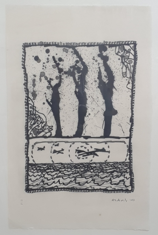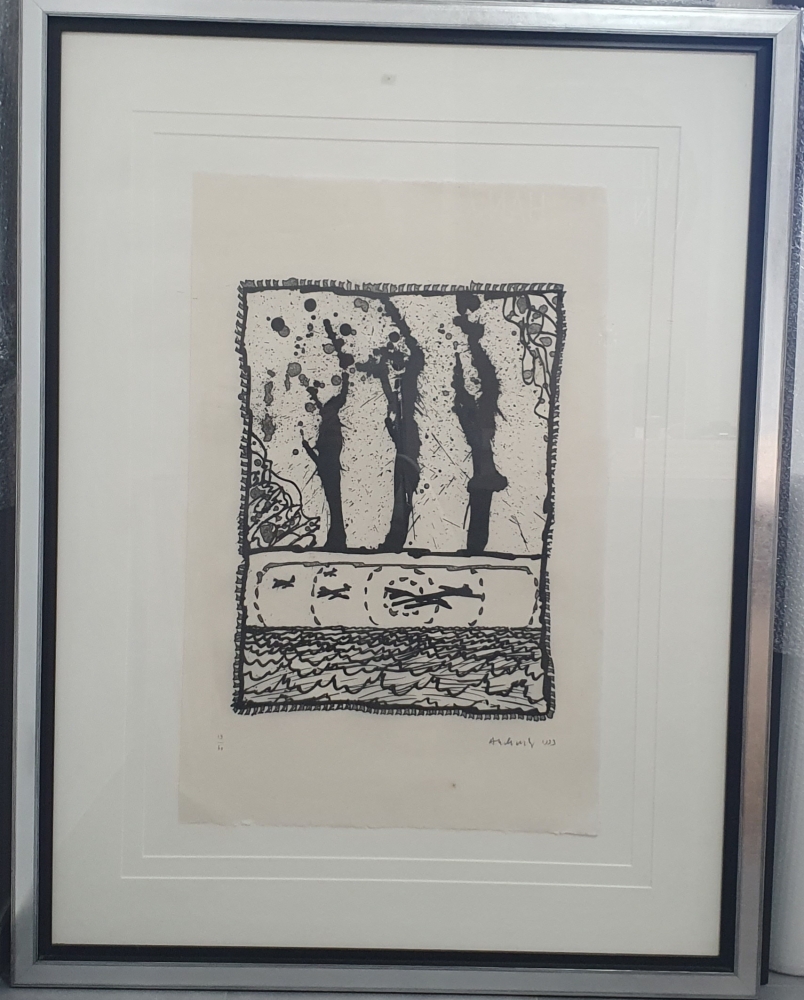 Grande eau-forte de Pierre Alechinsky sur papier de Chine. Dimensions du plateau : 95 x 64 cm. Dimensions de la gravure : 85 x 65 cm. Signé et numéroté sur 60 exemplaires. L'uvre est encadrée de trois doubles passe-partout et d'un cadre de couleur métal noir. Prix galerie : 3500 euros.