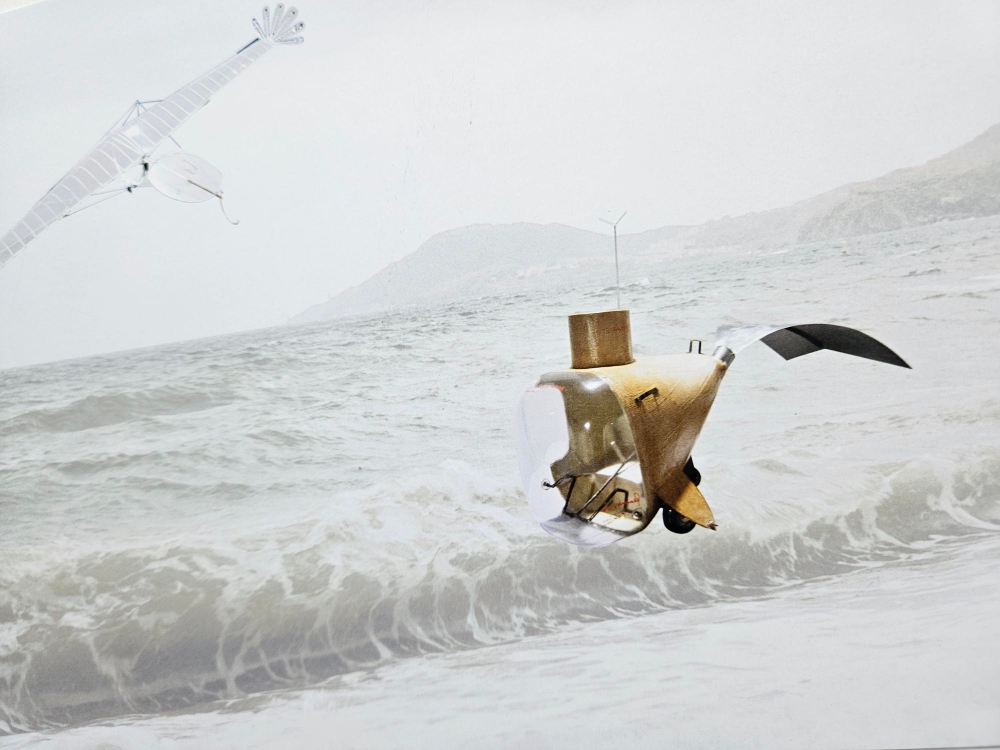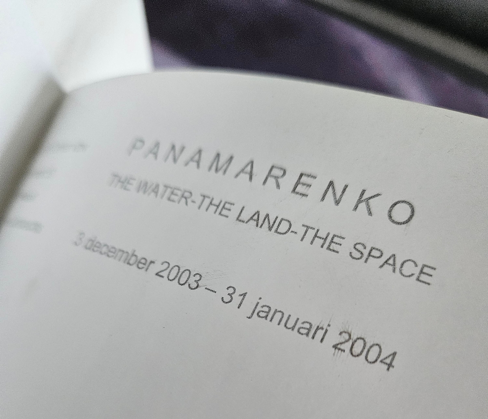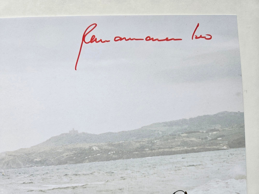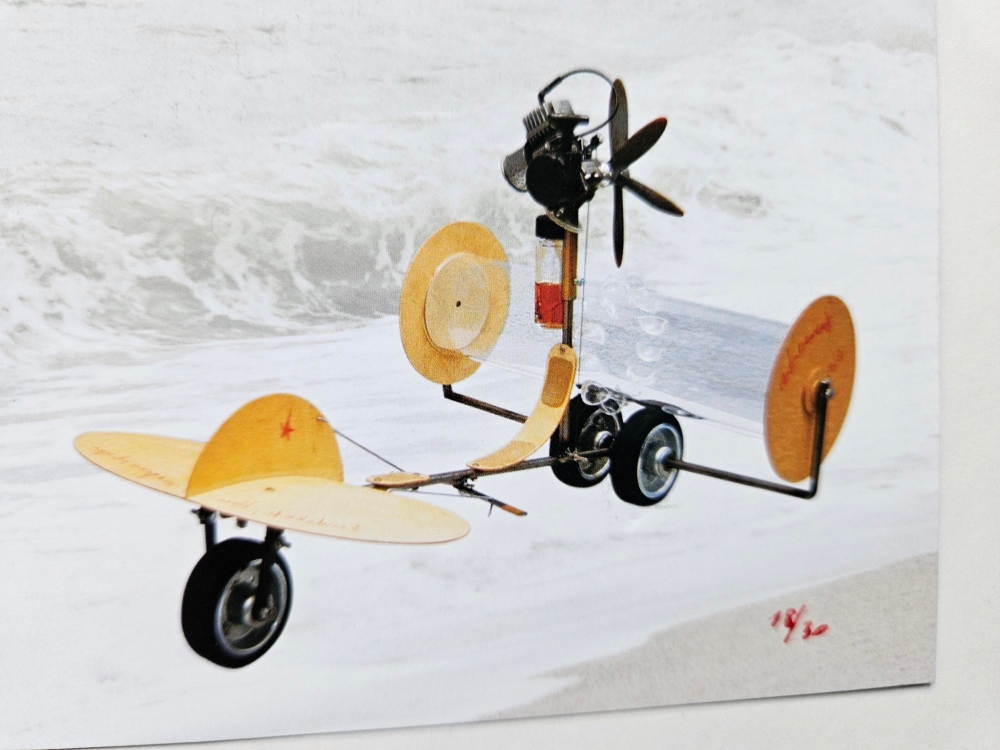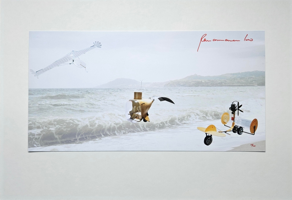 Bijzonder zeldzame offset van Panamarenko. Het betreft een uitnodiging voor de tentoonstelling The Water - The Land - The Space (december 2003 - januari 2004) in het Inter Art Center te Hasselt. Panamarenko heeft toen 30 uitnodigingskaarten gesigneerd en genummerd met rode stift. Het werk is momenteel deels bevestigd op karton en in perfecte staat.