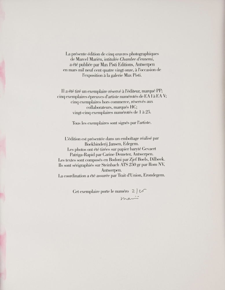 Complete set van 5 foto's uit de Chambre d'Ennemi portfolio, getiteld, gesigneerd en genummerd 5/25. Verkocht met de originele portfolio, getekend en genummerd op het colofon 5/25. Max Pisti Uitgaven, Antwerpen Zeer zeldzame uitgaven