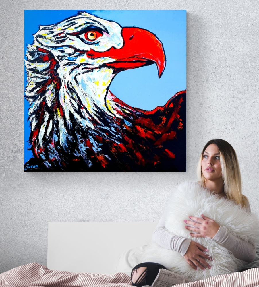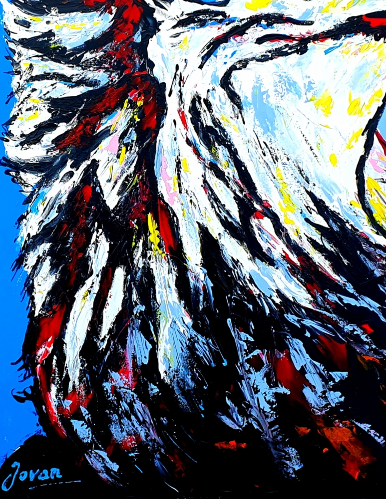 Uniek werk, uit serie schilderijen in Street / Pop art stijl, door Nederlands professioneel / hedendaagse kunstenaar Jovan Srijemac (1962). Werk is geschilderd op doek met acrylverf, paletmes. Schilderij is handgesigneerd, met echtheid certificaat, is gevernist en klaar om op te hangen. De zijkanten zijn geverfd als onderdeel van het schilderij en hoeven niet in te lijsten. Dit werk past goed in een modern interieur of kantoorruimte. `` De chaos van ideeën die in mijn hoofd zijn ontstaan, de innerlijke verstoken energie, wil eruit komen als een vulkaan en zo een explosie worden en een symfonie van kleuren op het doek, omlijst met materie, figuren, gezichten of abstracte compositie '' . Mijn werk staat dicht bij de expressionistische stijl, maar ik experimenteer graag met pop art en action painting. Mijn werk uit de jaren 80 was surrealistisch. Ik wilde de kijkers een boodschap brengen. Het hoofdthema ging over het leven in de wereld, tegen de oorlog. In de jaren 90 was mijn werk somber, donker van kleur, net als mijn gevoelens. Ik ben begin jaren negentig uit mijn land (voormalig Joegoslavië) ontsnapt toen de oorlog uitbrak. In de jaren 00 was ik op zoek naar kleur. tot dusver eindelijk gelukt. Mijn werk is nu kleurrijk, abstract expressionistisch. Het meeste werk is geschilderd met een pallet mes. Er is kleur op het doek aangebracht met een gevoel en emotie die diep uit mijn ziel komt. Thema is minder belangrijk als ik tevreden ben met de compositie en de kleur. Experimenteren in kunst, met stijlen, technieken, kleuren, etc, vind ik erg belangrijk. Ik denk: "Als je als kunstenaar je hele leven maar aan één stijl vasthoudt, dan ben je als kunstenaar dood." In de kunst en in het leven is voor mij één doel: doorgaan! En ik zeg vaak: "We weten niet wat er achter de gesloten deur verborgen is totdat we hem openen" Citat uit mijn boek : ''Apocalyps van de ziel'