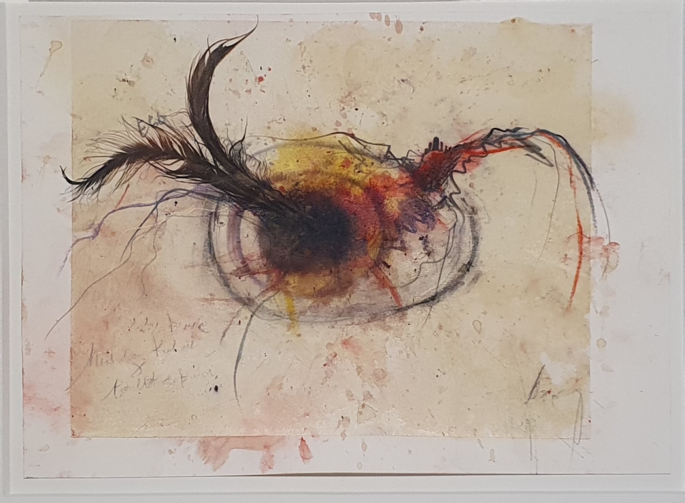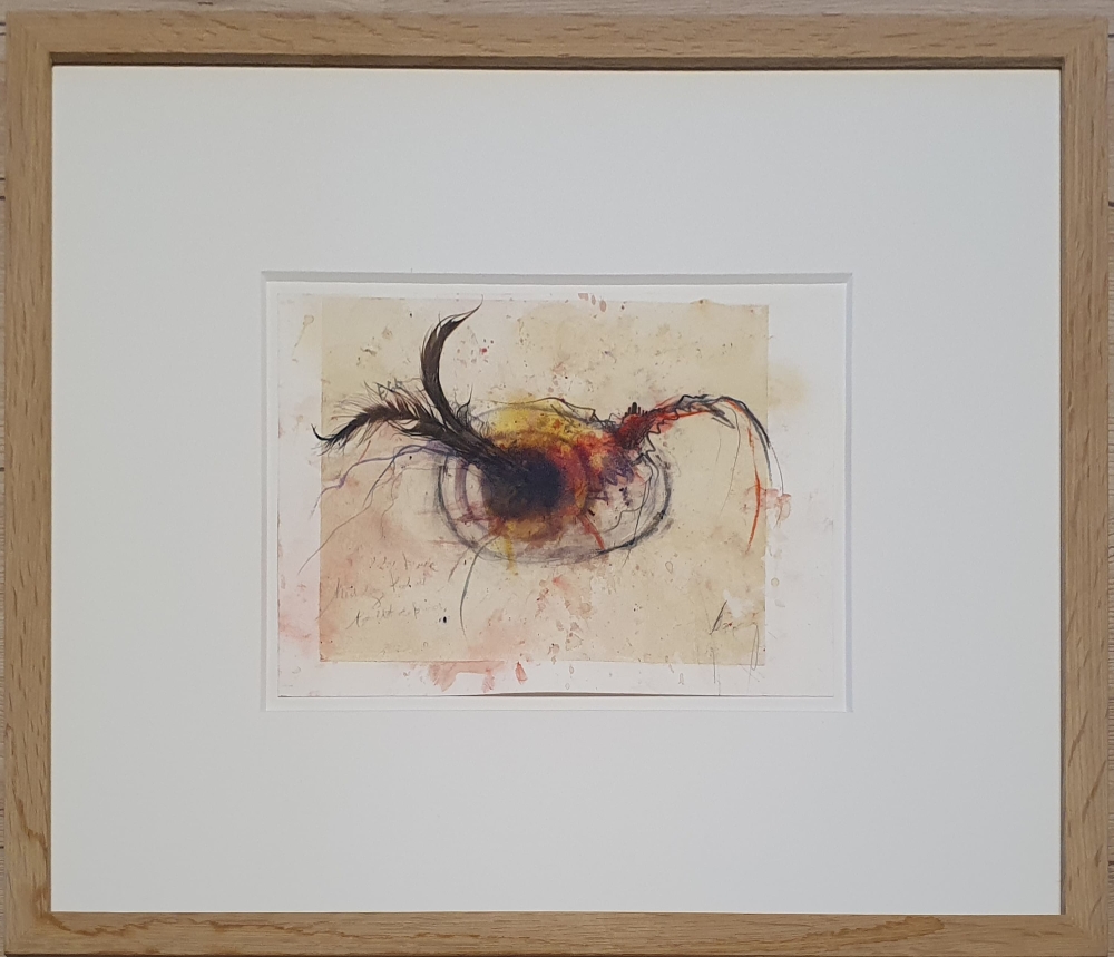 uvre unique et typique de Koen Vanmechelen issue de son projet Cosmopolitan Chicken. C'est un beau travail en techniques mixtes : dessin au crayon et collage avec, entre autres, du sang de poule et des plumes. Signé à la main par l'artiste. Encadré professionnellement avec du verre résistant aux UV et en parfait état.