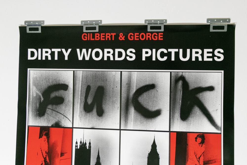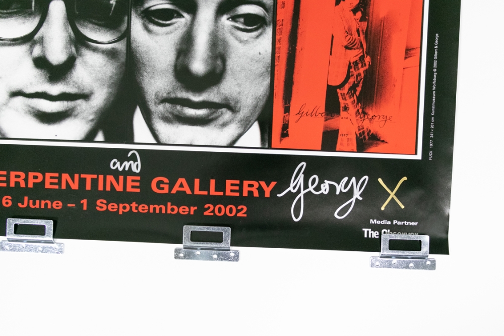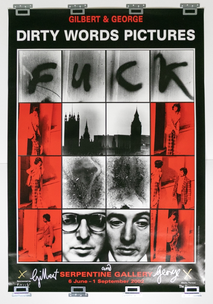 Affiche de l'exposition "Dirty Words Pictures" de Gilbert & George de 2002. Signée à la main par les deux artistes (en bas) au feutre argent.