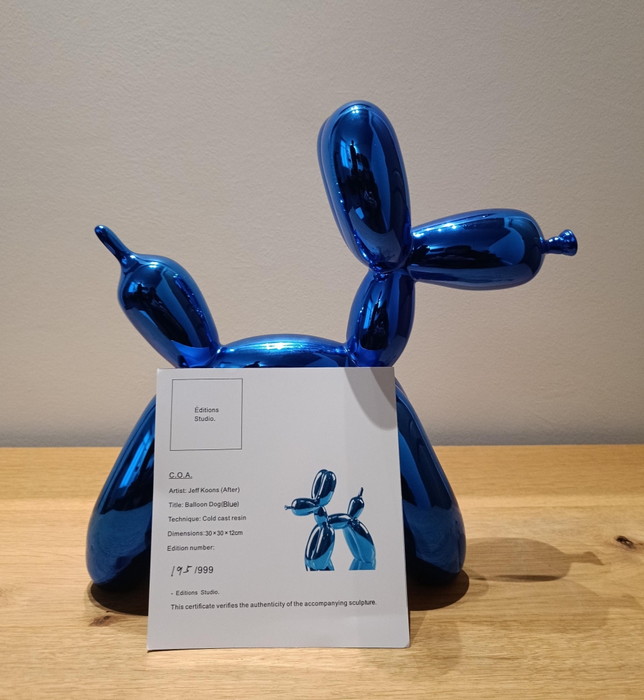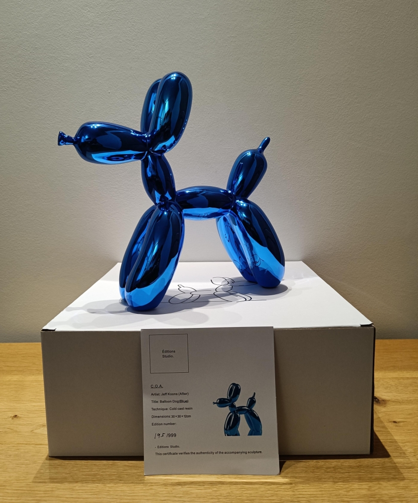 Jeff Koons (d'après) - Chien Ballon Blue Chrome Sculpture d'après une oeuvre originale de l'artiste plasticien américain Jeff Koons & Editions Studio, en édition limitée à 999 exemplaires. Certificat d'authenticité inclus (numéro 195 des 999 éditions) - gravé sur le bas de la statue Emballage original Dimensions: -Hauteur : 30cm -Largeur : 12cm -Longueur : 30cm Poids : environ 2 kg État : neuf/parfait Sera expédié avec suivi en ligne et trace, assurance et sera emballé en toute sécurité.
