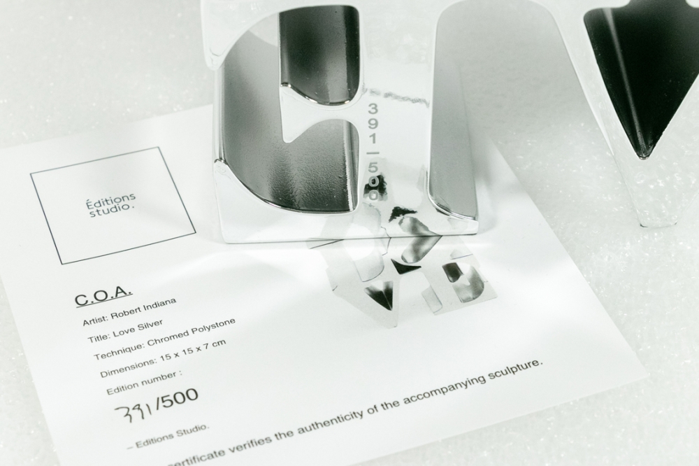 Sculpture en résine sortie aux Editions studio de la sculpture "Love" de Robert Indiana. Le travail est limité à 500 pièces, dont il s'agit du numéro 391. Le travail est en bon à excellent état et très rarement offert.
