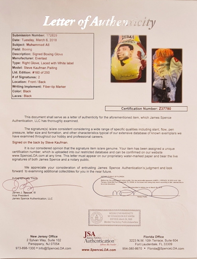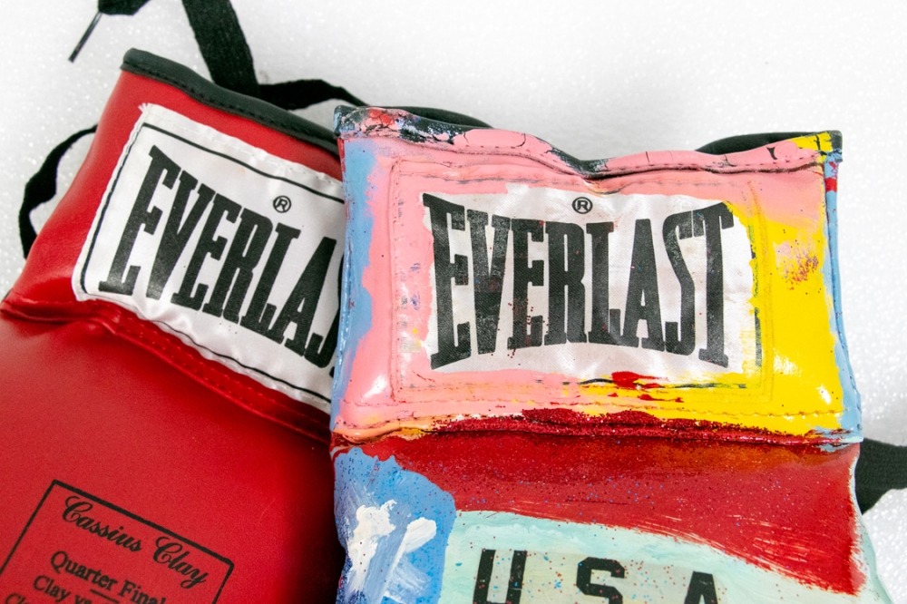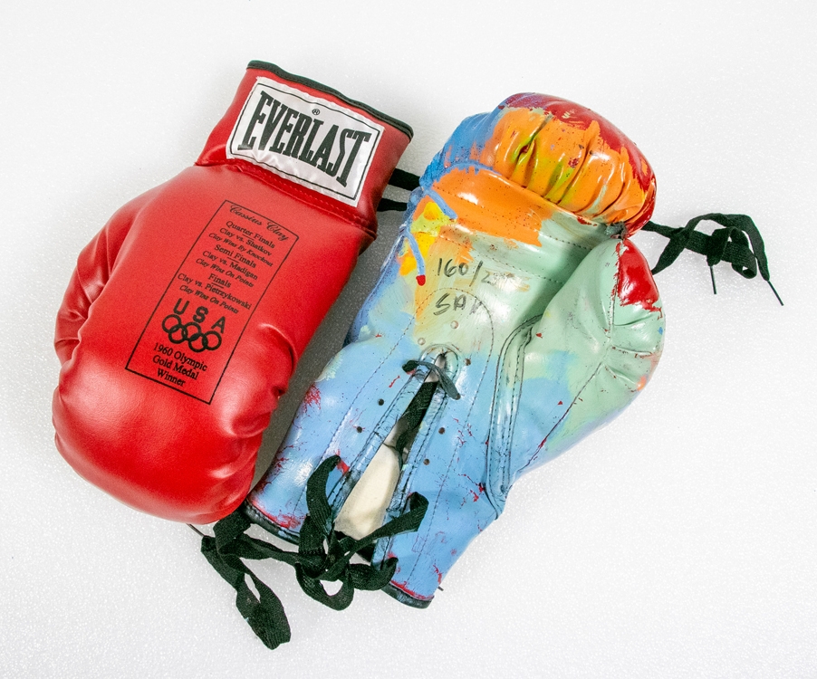 Ensemble de gants de boxe lancé à l'occasion de la victoire olympique de Muhammad Ali en 1960. Cet ensemble est encore plus spécial, car il est peint de manière unique par Steve Kaufman et sérigraphié à l'effigie de Muhammad Ali. De plus, tous les gants personnalisés sont également signés par Steve Kaufman (au dos "SAK") et par Muhammad Ali. Cette édition a été créée peu après 1960 et était limitée à 250 exemplaires réguliers et 250 exemplaires de luxe. Il s'agit d'un exemplaire de luxe. Voir aussi le site Web de Steve Kaufman. Le gant gauche répertorie les matchs et les victoires de Muhammad Ali, alias Cassius Clay lors des JO de 1960.