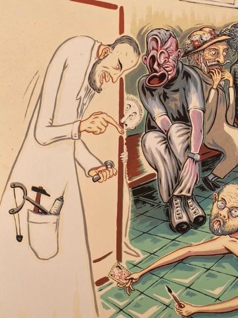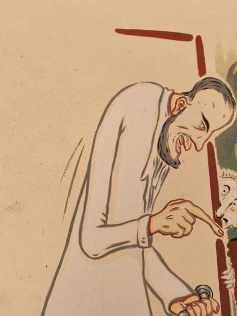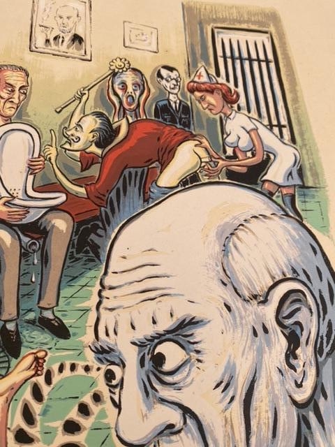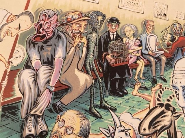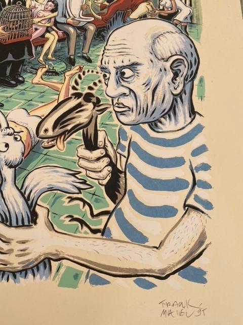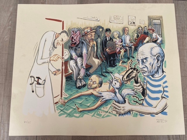 Original screen print by Frank Maieu (Wilrijk, 1952) - Signed and numbered (34/85) in pencil - Title: "Au suivant" - Year: 95 (in pencil) Some small spots around the leaf. Frank Maieu is trained as regent plastic arts at the Rijksnormaalschool in Ghent (1971-73) where he is taught by Octave Landuyt, among others. Starting from a deep sense of the fantastic and surreal, drawing on a boundless imagination and with the necessary sense of irony and self-relativity, Frank Maieu constructs works that stand out for their unusual sense of structure and composition. Painterly, he sometimes uses very realistic lines (sometimes even related to the New Objectivity style of an Otto Dix), then again a looser, more expressionistic style, sometimes bordering on the caricature. The paintings are complemented by mini sculptures in ceramics in combination with other materials such as iron, wood and stone