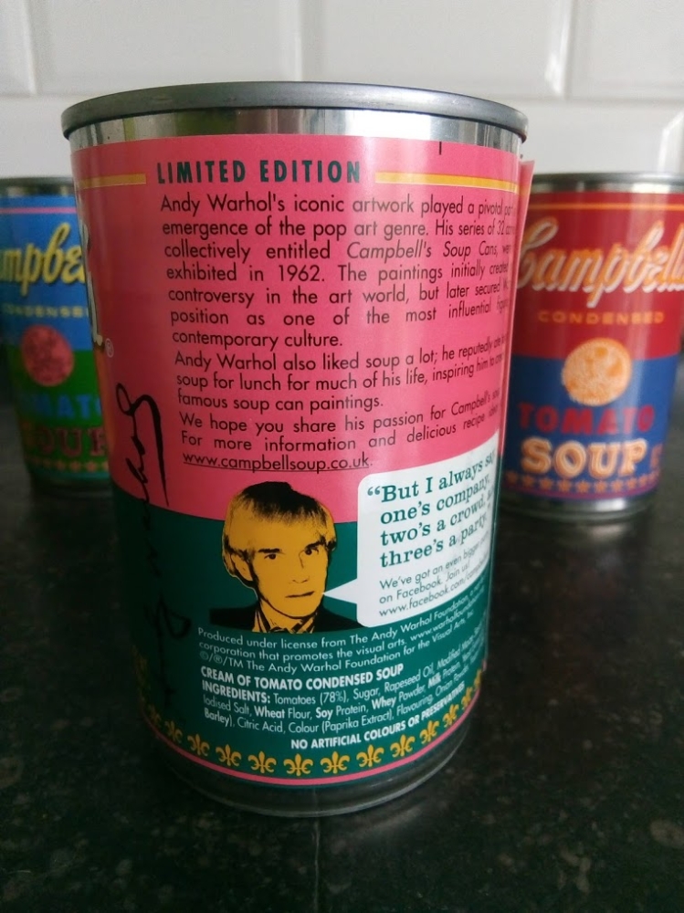 4 x Campbell's Soup Limited Edition Andy Warhol Cans, 2012 - rarement trouvé en ensemble complet - édition britannique, plus rare que l'édition américaine. Très bonne condition. Pour célébrer le 50e anniversaire de l'uvre emblématique de 1962 de l'artiste pop Andy Warhol, "32 Campbell's Soup Cans", Campbell's a publié une série de boîtes à soupe en édition limitée inspirées des uvres d'art d'Andy Warhol en collaboration avec la Fondation Andy Warhol. Les quatre boîtes de couleurs différentes sont vendues chez Target pour commémorer 50 ans de soupe. Les boîtes contiennent le portrait, la signature et les citations de Warhol, notamment: "À l'avenir, tout le monde sera célèbre dans le monde entier pendant 15 minutes", "Le monde me fascine", "Le Pop Art est pour tout le monde", "Mais je dis toujours la compagnie de quelqu'un, deux est une foule et trois est une fête." Approuvé par la Fondation Warhol.