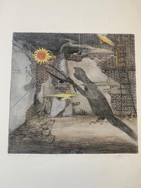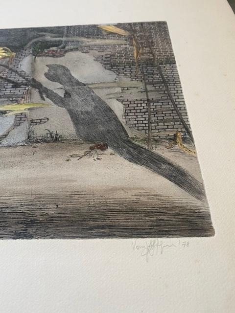 Gravure en couleurs de Roger Van Akelynen. Signé et daté. Quelques signes d'âge autour de la feuille. L'image elle-même n'a rien à voir là-dedans. Avec encadrement et passe-partout un travail parfait. L'oeuvre date de 1978.