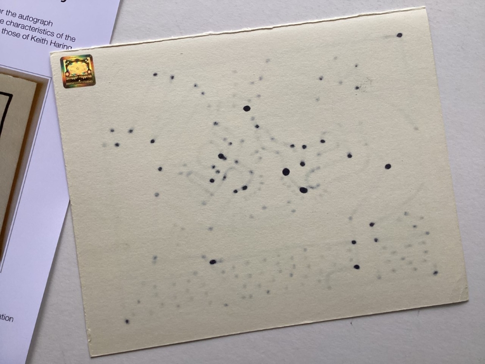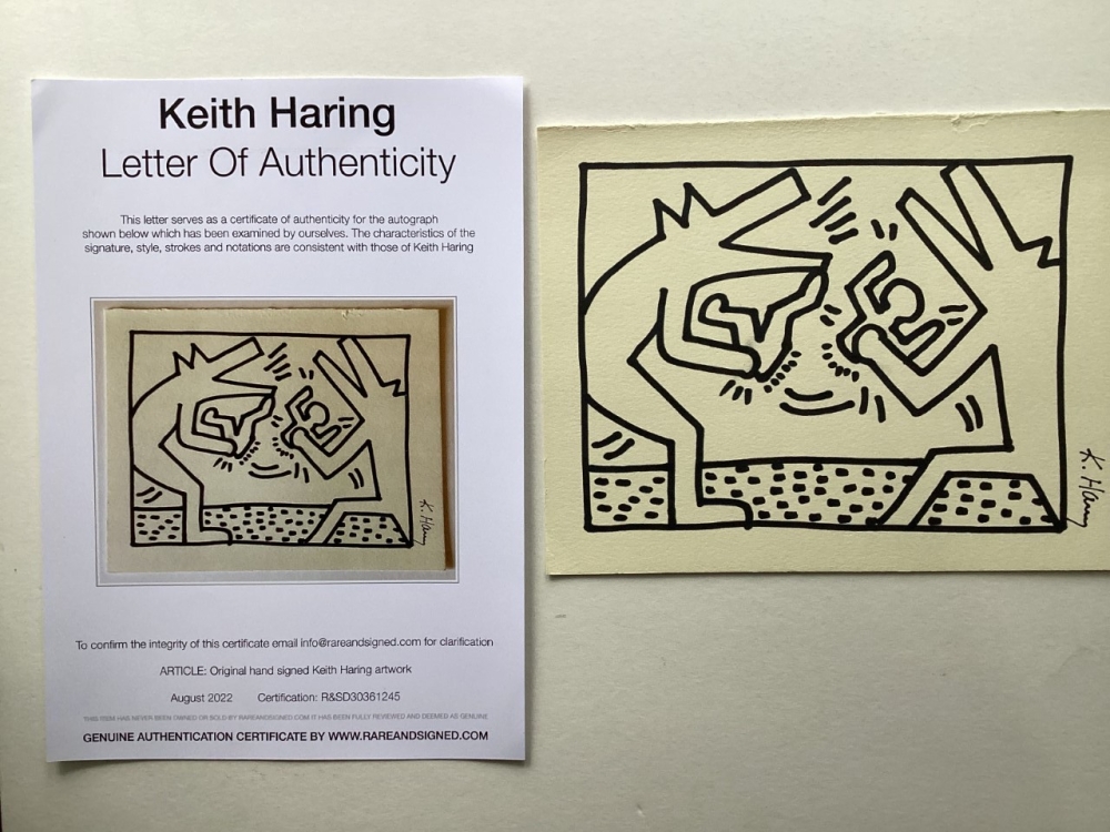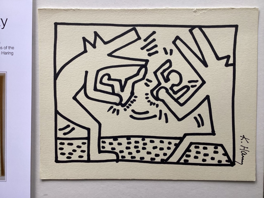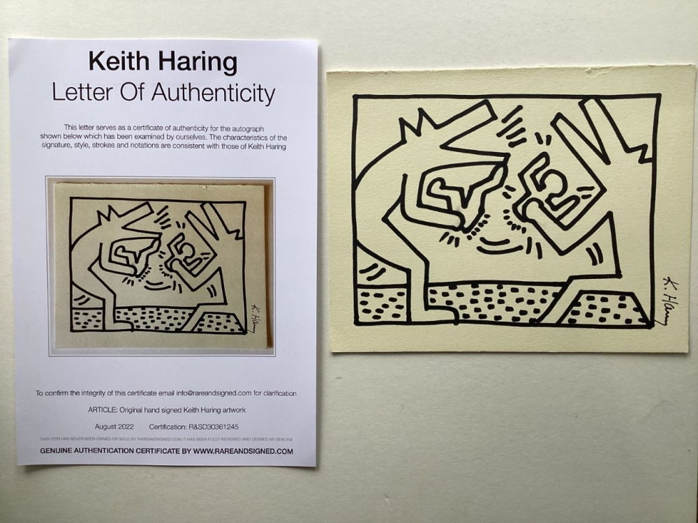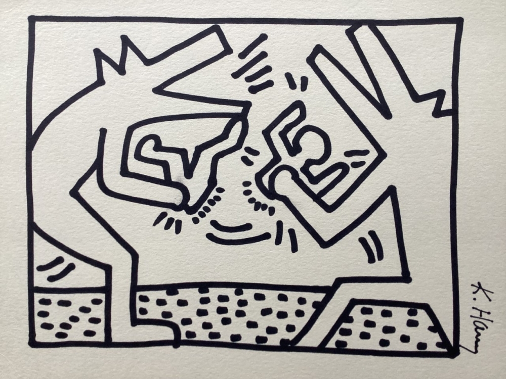 Keith Haring (attributed), ink drawing - Dogs Keith Allen Haring (May 4, 1958 February 16, 1990) was an American artist whose pop art emerged from the New York City graffiti subculture of the 1980s. His animated imagery has "become a widely recognized visual language".[2] Much of his work includes sexual allusions that turned into social activism by using the images to advocate for safe sex and AIDS awareness.[3] In addition to solo gallery exhibitions, he participated in renowned national and international group shows such as documenta in Kassel, the Whitney Biennial in New York, the São Paulo Biennial, and the Venice Biennale. The Whitney Museum held a retrospective of his art in 1997.