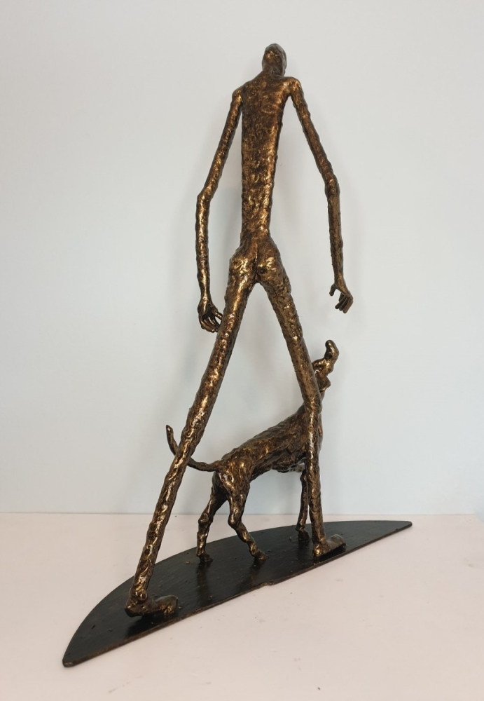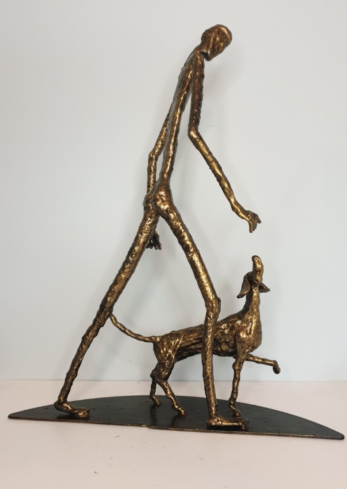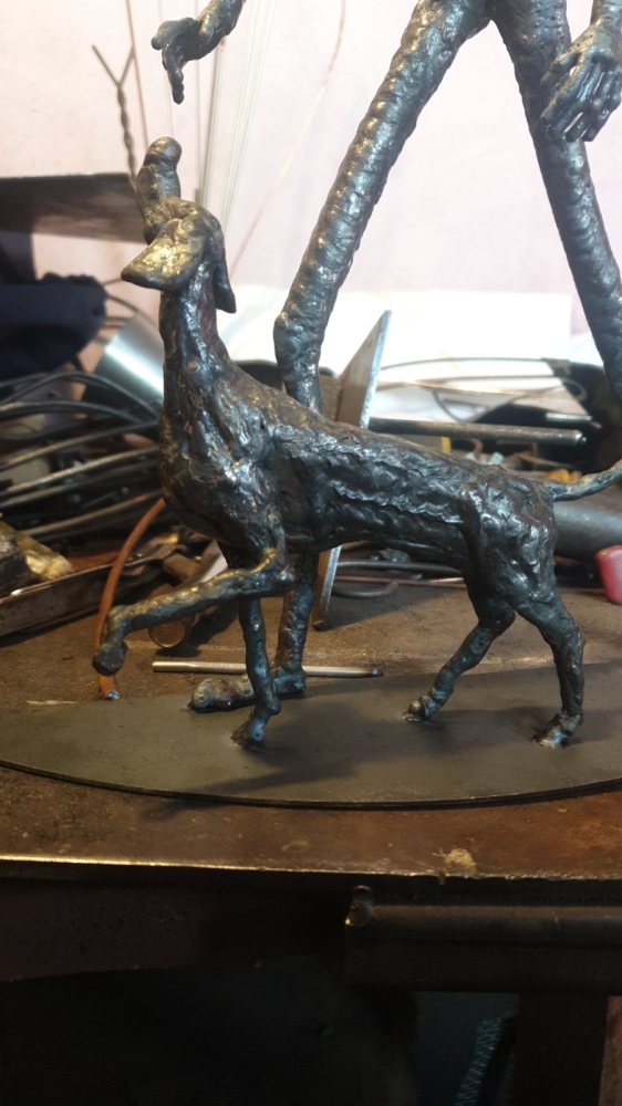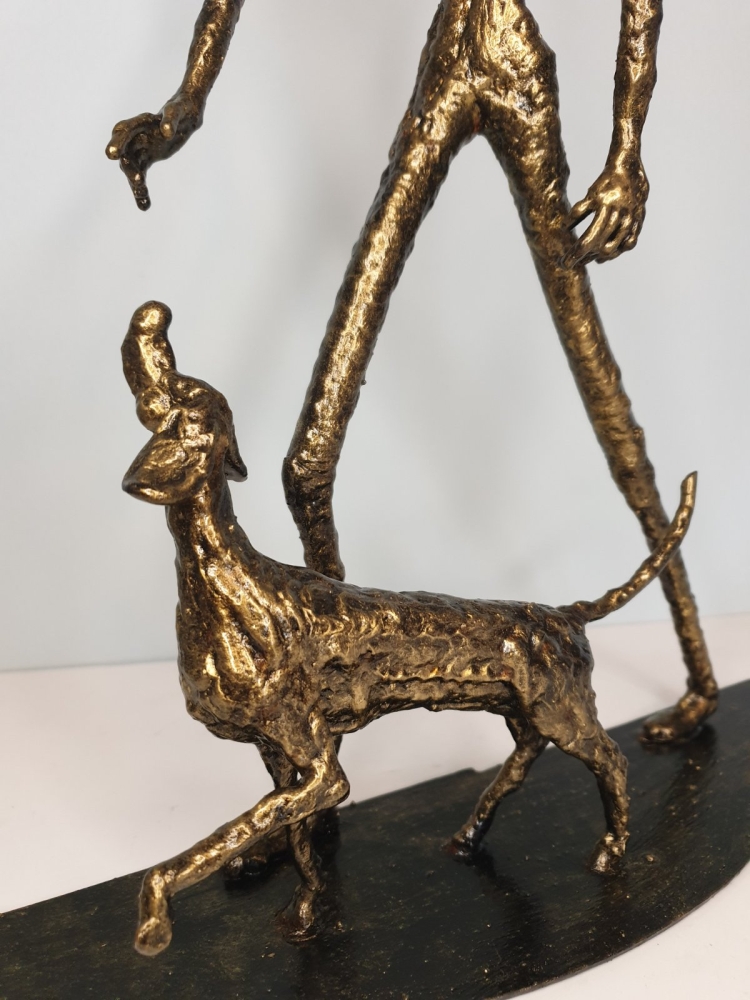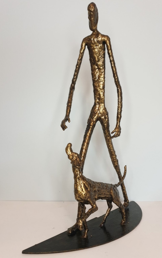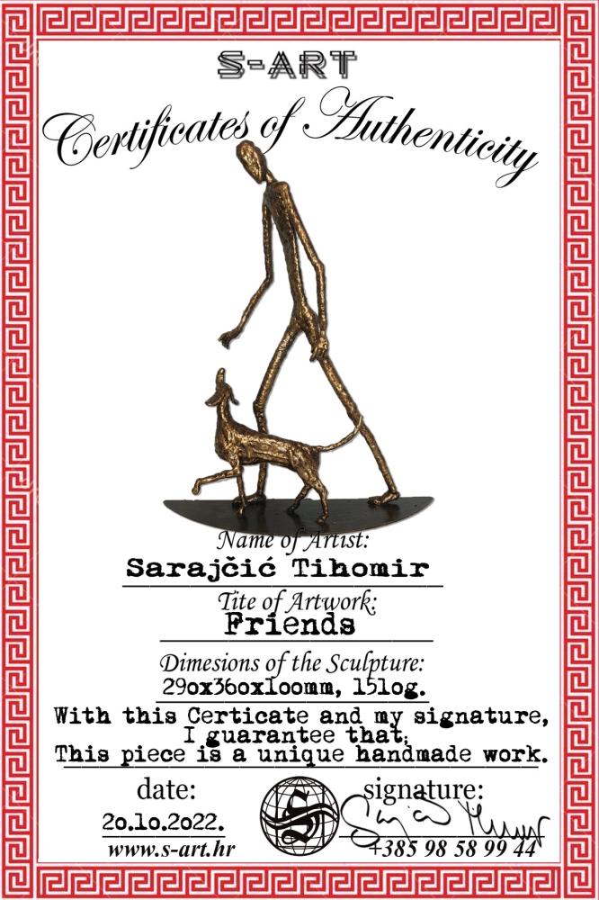 Friends, man with dog - metal sculpture, welding and forging, it is not a casting... Material: carbon steel Color: black with golden wax, Dimensions: 360x290x100mm, 1510g, only for indoor use...... One of a kind work Unique work, comes with a certificate of authenticity. IMPORTANT NOTE: SHIPPING TO THE EU ONLY - NO SHIPPING TO NON-EU COUNTRIES. Tihomir Sarajcic is owner of S-art a Croatian craft studio/workshop that composes sculptures with welded and painted iron/ metal and wall art. Exhibitions since 2015 in city library Slavonski Brod. The S-art studio also participate on art festivals..... www.s-art.hr