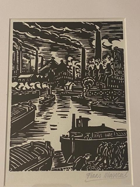 Très belle gravure sur bois de Frans Masereel. Signé et encadré à la main. Frans Laurent Wilhelmina Adolf Lodewijk Masereel était un graphiste, sculpteur sur bois, peintre et dessinateur belge. Il est considéré comme l'un des artistes graphiques les plus importants du XXe siècle