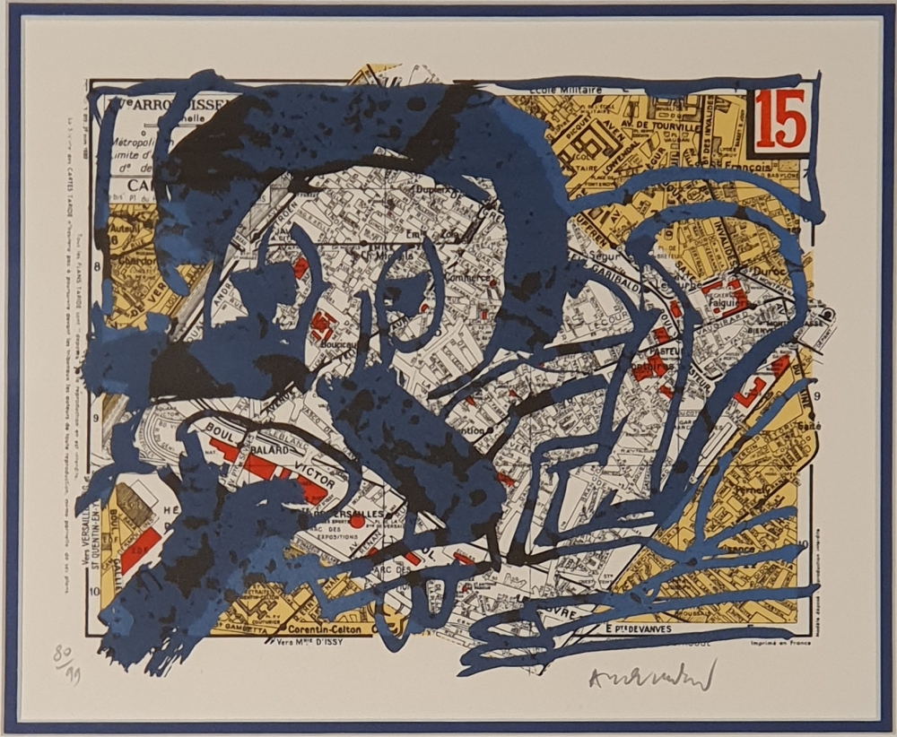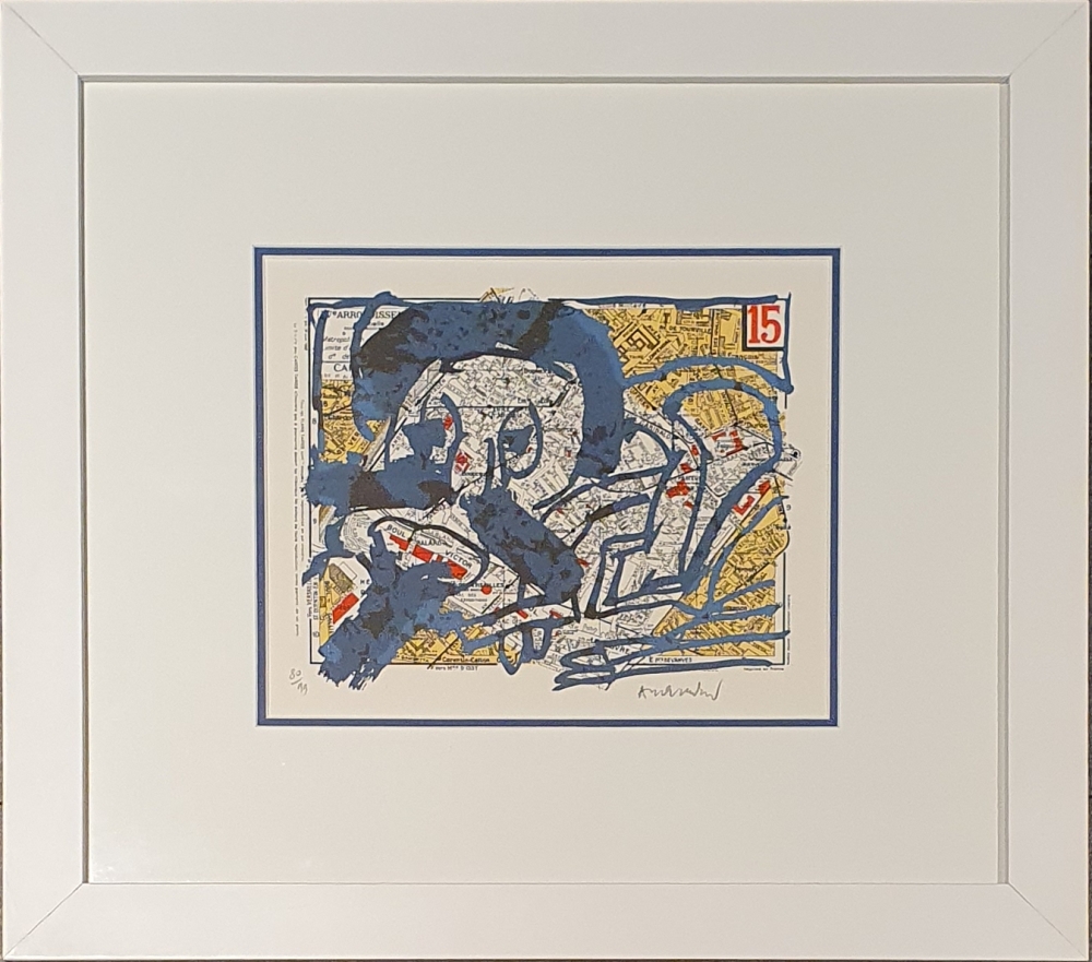Belle lithographie en couleurs de l'artiste belge Pierre Alechinsky L'uvre est l'une des 21 lithographies du portfolio "Arrondissements" de 1983. L'oeuvre est signée et numérotée 80/99. L'oeuvre est en bon état et est encadrée d'un double passe-partout.