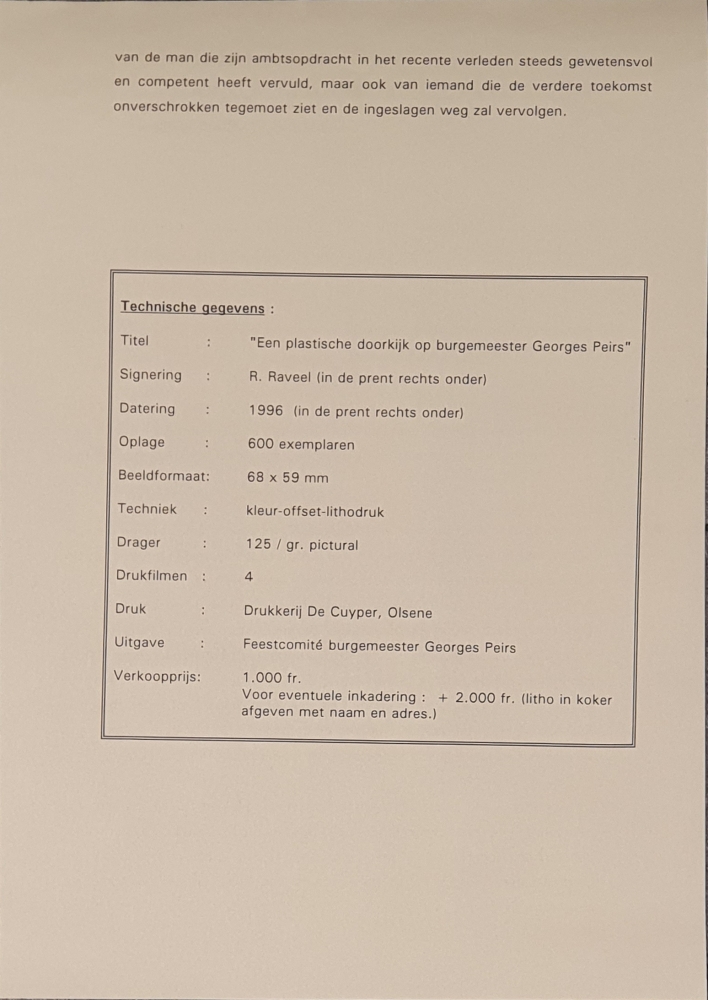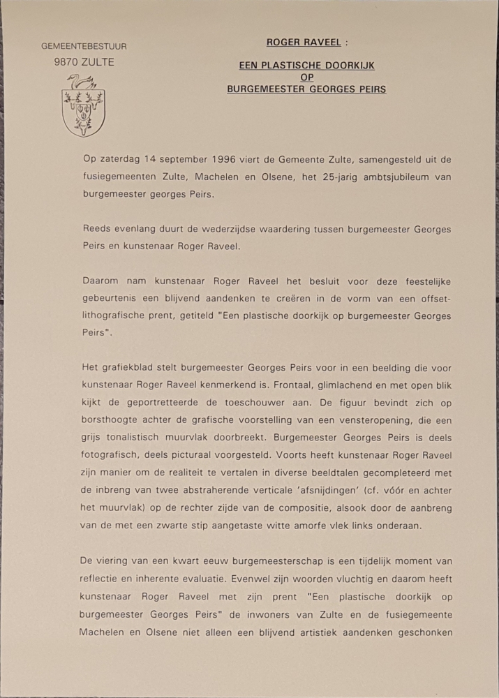 Belle lithographie offset de l'artiste belge Roger Raveel. Les travaux ont été réalisés à l'occasion du mandat de 25 ans du maire de l'époque, Peirs. L'oeuvre est signée dans l'estampe et numérotée 255/600. La lettre explicative, émanant de la commune de Zulte, est jointe à cet ouvrage. L'oeuvre n'est pas encadrée.