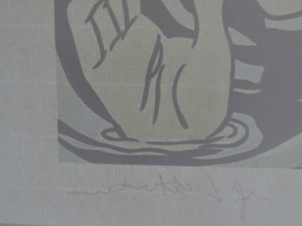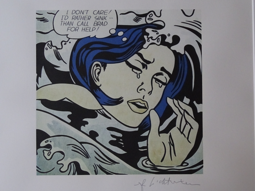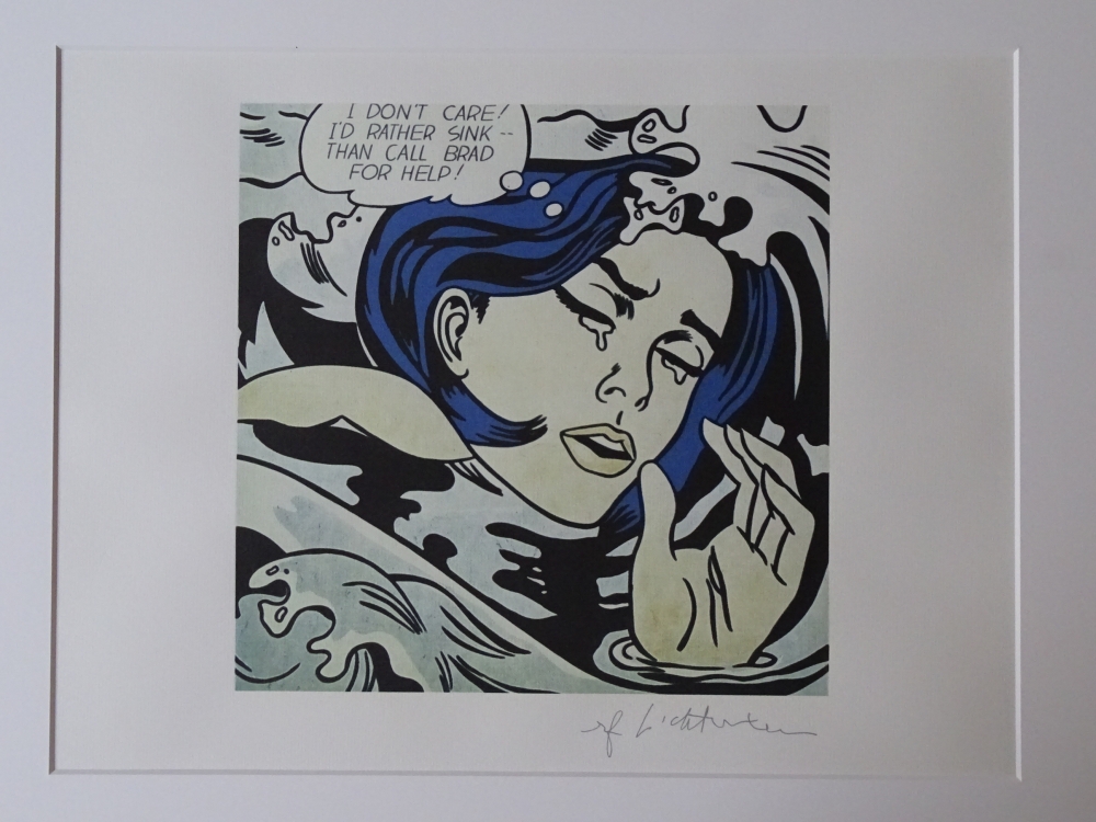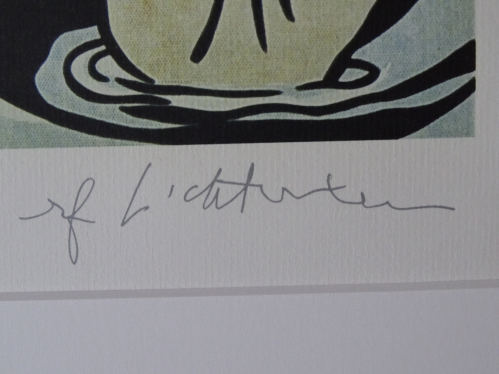 Roy Lichtenstein lithograph, 50x40cm including the mat Roy Fox Lichtensteinwas an American pop artist. During the 1960s, along with Andy Warhol, Jasper Johns, and James Rosenquist among others, he became a leading figure in the new art movement. His work defined the premise of pop art through parody. Inspired by the comic strip, Lichtenstein produced precise compositions that documented while they parodied, often in a tongue-in-cheek manner. His work was influenced by popular advertising and the comic book style. His artwork was considered to be "disruptive". He described pop art as "not 'American' painting but actually industrial painting". His paintings were exhibited at the Leo Castelli Gallery in New York City.
