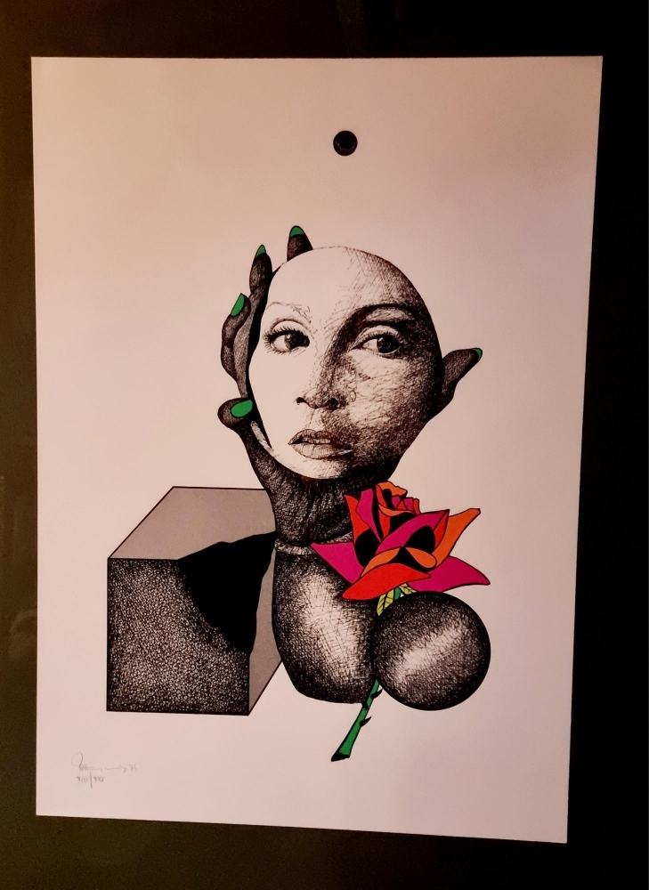 - Originele kleurenzeefdruk van Paul Van Hoeydonck (Antwerpen, 1925) - Handgesigneerd en genummerd in potlood - Uitgever: Lions Club, Antwerpen-Zuid - Drukatelier: Beka-Screen, Ekeren Paul Van Hoeydonck studeerde aan het Kunsthistorisch Instituut in Antwerpen en ook aan het Instituut voor Kunstgeschiedenis en Oudheidkunde in Brussel volgde hij cursussen. Daarna ging hij vooral als autodidact zijn eigen weg, waarbij hij één van de Belgisch-Nederlandse kunstenaars van de Nul-beweging was. Dit is de Nederlandstalige tegenganger van de Duitse Zero-groep. Hij toonde vooral belangstelling voor de aanwezigheid van de mens in de ruimte. Hij gaf de planeten en de constellaties een plaats in zijn schilderijen. In 1971 zetten de astronauten van de Apollo 15 zijn beeldje "Fallen Astronaut" op de maan. Dit is het enige kunstwerk dat zich in de ruimte bevindt