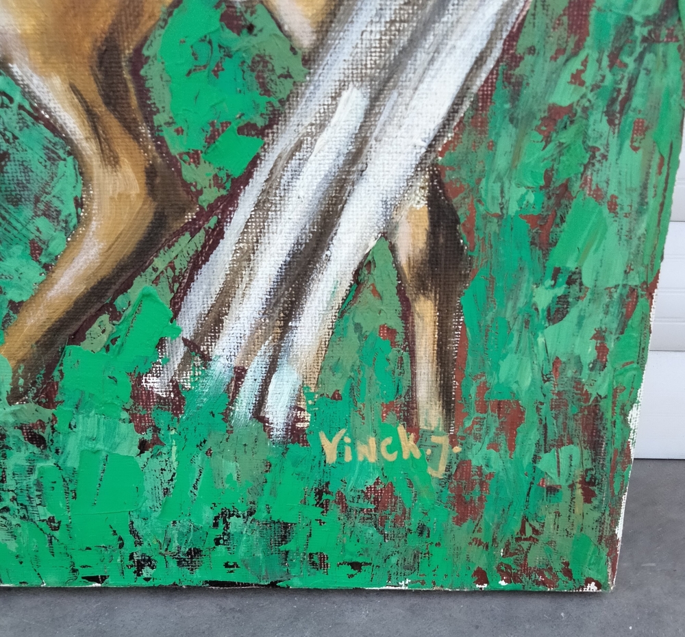 L'une des dernières uvres d'art du peintre anversois Jozef Vinck. C'est pourquoi l'uvre est méconnue et encadrée. C'est une pièce unique et donc il n'en existe pas 2. Vinck est connu pour avoir remporté divers prix tels que le prix Rembrandt. Jozef Vinck (Berchem, 3 décembre 1900 - Mortsel, 4 juillet 1979) était un artiste belge. Formation à l'Institut Supérieur des Beaux-Arts d'Anvers, sous la direction de Frans Hens. Professeur à l'Académie Royale des Beaux-Arts d'Anvers, 1943-1947 Professeur à l'Institut national supérieur des beaux-arts d'Anvers, 1947-1966 Membre de la Commission spéciale du Musée royal des Beaux-Arts d'Anvers Prix : 1936 le prix François Franck 1943 Prix des Amis des Arts Populaires 1944 prix August Oleffe Médaille 1953 à la Biennale de Menton 1969 Prix international Rembrandt, Bâle-Anvers A partir de 1922, avec son ami et âme sur Albert van Dyck (1902-1951), il participe régulièrement aux Salons de 'Kunst van Heden' et 'Als ick Kan' à Anvers, 'Orientations' et 'Les Compagnons de l' art' à Bruxelles. Vers l'an 30, Vinck et ses contemporains War van Overstraeten, Albert Dasnoy, Albert van Dyck, Henri-Victor Wolvens se sont fait connaître. Après tout, l'expressionnisme et l'avant-garde ont commencé à décliner. Ces jeunes tendaient plutôt à la simplicité, à la naïveté, à une représentation purement naturelle des gens et des choses, à plus d'intimité. Avec 'De Wandelaar' de 1933, Jozef Vinck sent qu'il a trouvé son propre style. D'une part, les influences de l'expressionnisme sont toujours présentes dans cette uvre : le ton général brique-chaud de Gust de Smet et la raideur de Brusselmans. D'autre part, Vinck considérait cette toile comme le début de son style.
