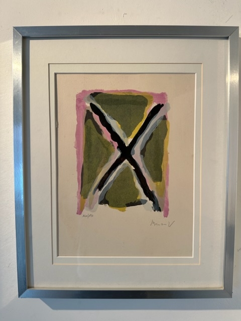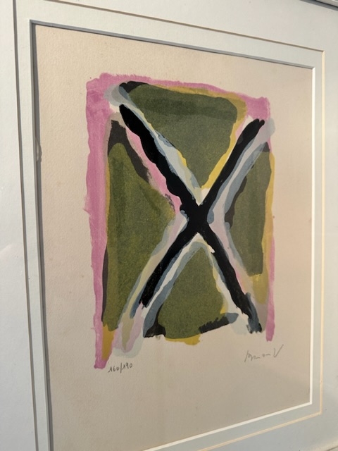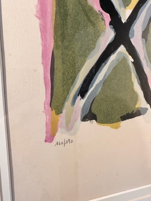 Fraaie litho van Bram Van Velde. Werk is in goede staat. Gesigneerd en genummerd in potlood. Bram van Velde werkte op zijn twaalfde bij een firma voor woninginrichting om in de behoeften van de familie te voorzien. Hij was een natuurtalent, kopieerde al vroeg de oude meesters en decoreerde meubels en lampenkappen voor zijn firma. Zijn werkgever had oog voor zijn grote talent en stimuleerde hem zich verder te ontwikkelen. Bram van Velde volgde zijn opleiding bij schilder- en decoratie-atelier Van Schaijk. Woont en werkt in Frankrijk Bram van Velde vertrok naar Duitsland en vestigde zich in de kunstenaarskolonie van Worpswede. Hier maakte hij behalve een aantal schilderijen in expressionistische stijl zijn eerste litho - een zelfportret. Het verscheen in een uitgave van de kunstenaarskolonie in een oplage van 500 exemplaren. In 1924 vertrok hij samen met zijn broer Gerard naar Parijs. Parijs was echt Bram van Veldes leerschool.