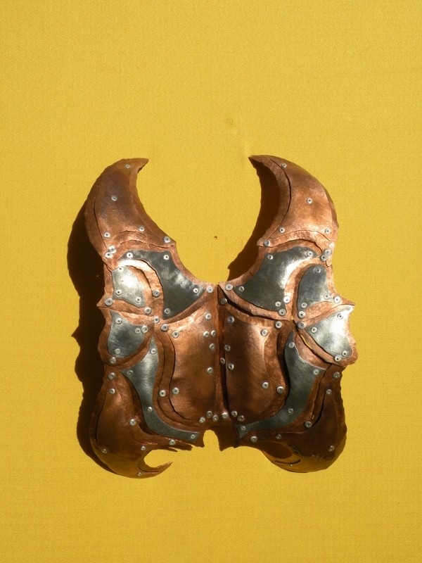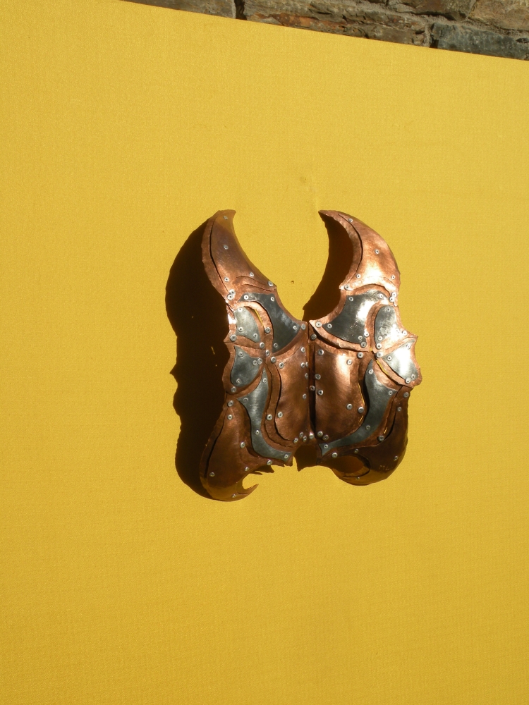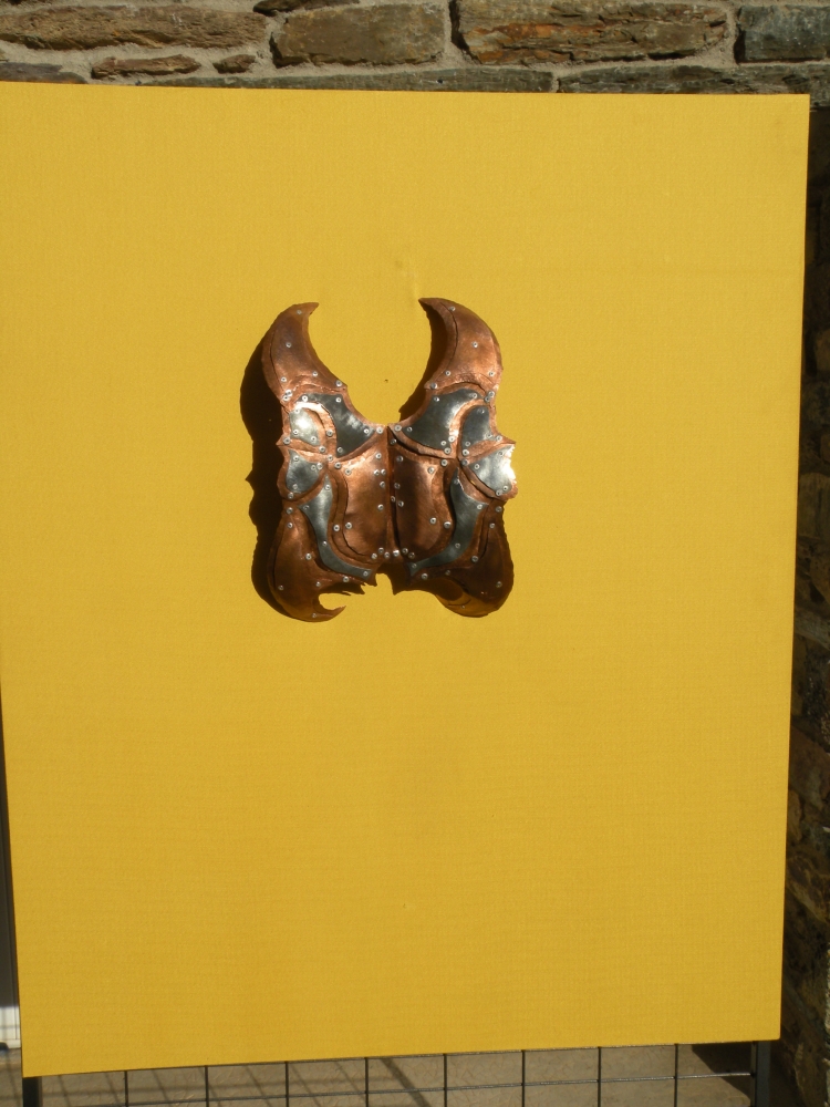 Petit relief "Carapace Scarabé" en métal, d'après un dessin original de l'Artiste. Réalisé en feuille de cuivre, zinc et acier, assemblé avec rivets et verni. Oeuvre faisant partie de la Famille d'oeuvres "Carapace" imaginée en 2005, pièce unique, Oeuvre d'Art contemporain, à placer uniquement dans son intérieur au mur ou sur un fond.