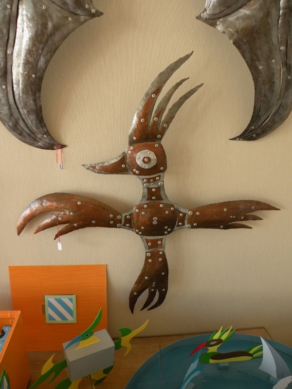 Relief mural "Oiseau" en métal, d'après un dessin original de l'Artiste. En tôle de cuivre, zinc et acier fin, formes martelées, assemblées par rivets et vernis. uvre d'art contemporain imaginaire, pièce unique, recherche plastique, à présenter dans son intérieur seul seul au mur ou sur fond, au choix.