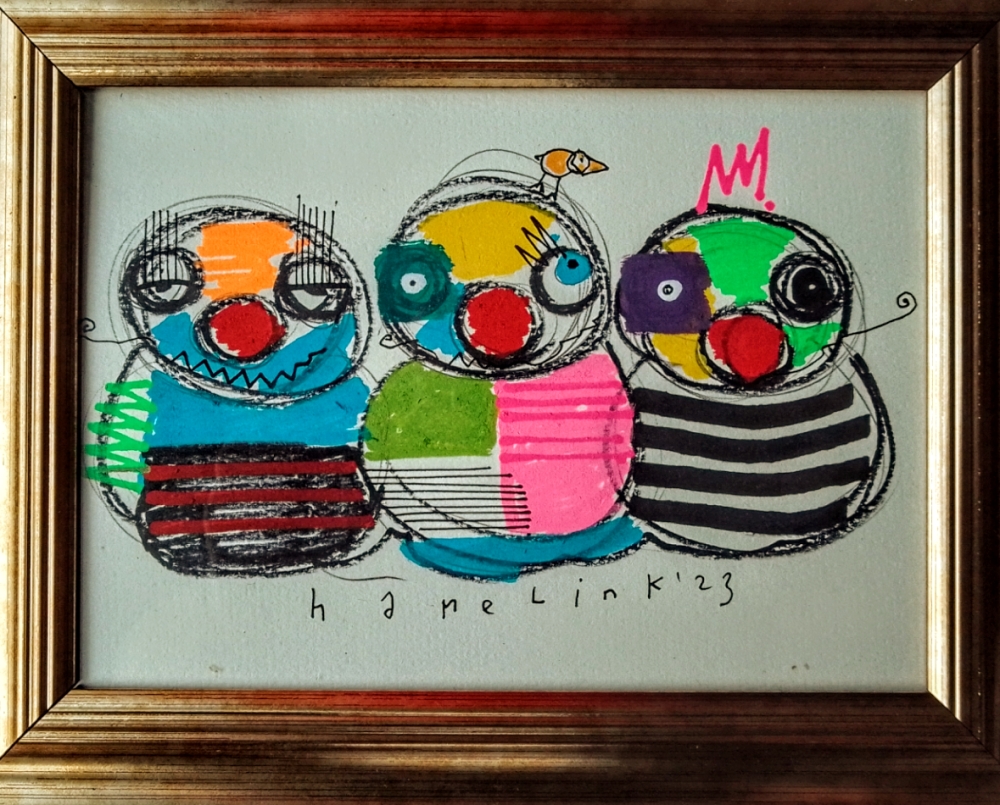 Jolie petite illustration d'art de 3 clowns aux jolies couleurs. Hande a fait 2023 bij the Dutch Illustrator hamelink, vous pouvez voir plus de travail sur www.hanekinkart.nl . Fabriqué avec de l'encre, de l'acrylique, un marqueur. Ce travail est cadre incl.