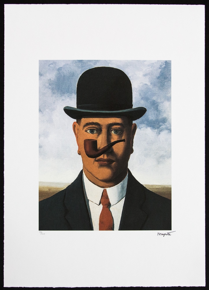 René Magritte (d'après) Lithographie offset "Bonne Foi", édition limitée à 100 exemplaires, planche signée en bas à droite, numérotée au crayon en bas à gauche 39/100, cachet de la maison d'édition en bas à gauche "SPADEM, Paris", papier d'art, format feuille : 50 x 70cm, sans documentation supplémentaire, vendu non encadré ; nous offrons l'expédition interne, si l'acheteur gagne plusieurs articles, nous combinerons l'expédition