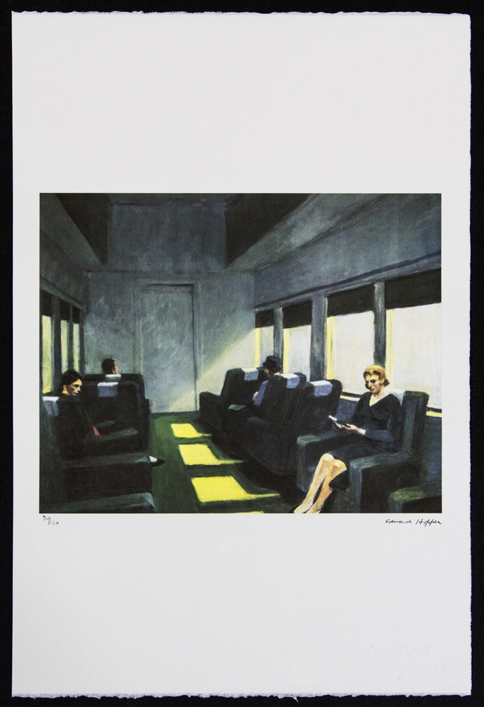 Edward Hopper (d'après) "Chair Car" édition limitée 90/150, lithographie offset, signée en bas à droite, numérotée au crayon en bas à gauche, cachet de gaufrage en bas à gauche "Georges Israel Editeur", papier coton Arches France, format feuille 38 x 57 cm, sans documentation supplémentaire, vendu non encadré ; nous offrons l'expédition interne, si l'acheteur gagne plusieurs articles, nous combinerons l'expédition