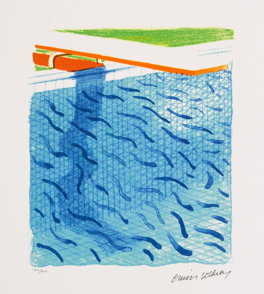 David Hockney (d'après) "Pool" édition limitée à 200 exemplaires, lithographie offset, planche signée en bas à droite, numérotée au crayon en bas à gauche 144/200, papier coton épais, avec tampon en relief SPADEM, Paris, format feuille 35 x 50cm, sans documentation supplémentaire, vendue sans cadre ; nous offrons l'expédition interne, si l'acheteur remporte plusieurs articles, nous combinerons l'expédition