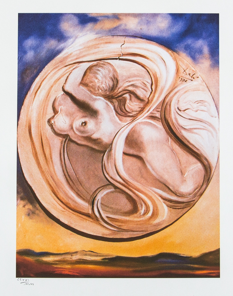 Salvador Dali (d'après) Lithographie offset "Space Eve", format feuille 50 x 65 cm, signée en bas à droite "Dali", numérotée au crayon en bas à gauche CCXXI/MM, édition limitée 2000, papier fort filigrané BFK Rives France, édition en bas centré cachet maison "G. Dali", sans documentation supplémentaire, vendu non encadré; nous offrons l'expédition interne, si l'acheteur gagne plusieurs articles, nous combinerons l'expédition