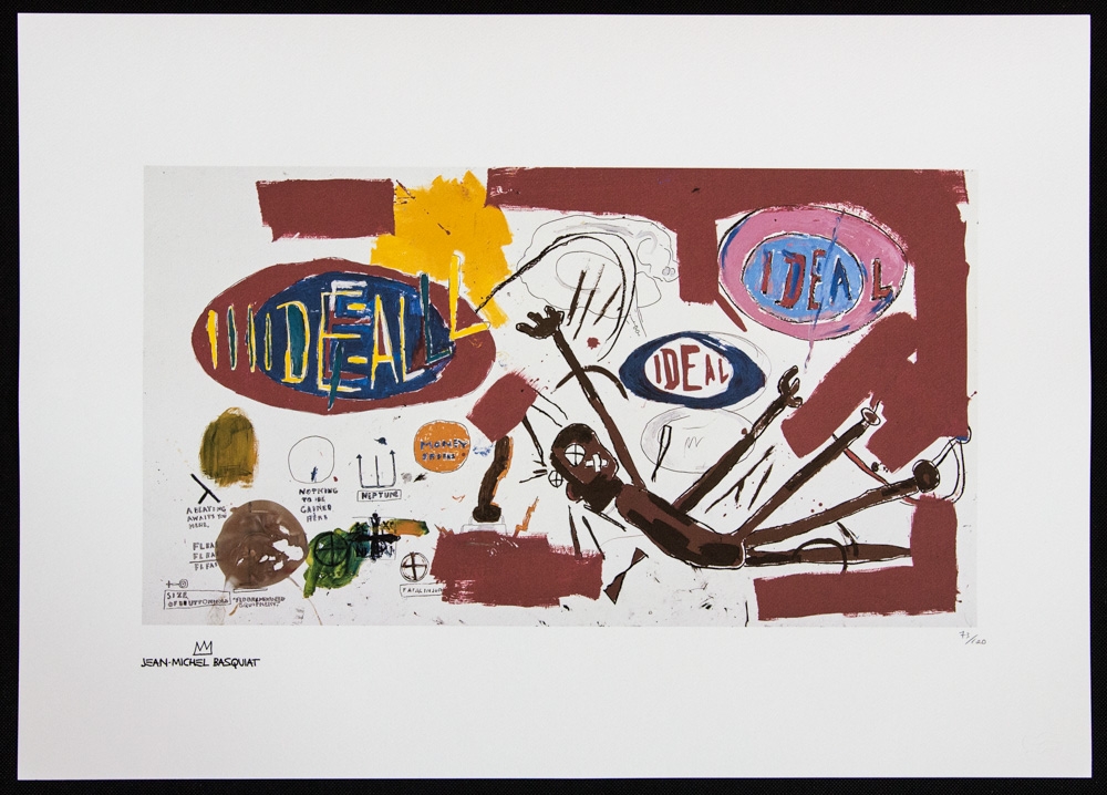 Jean-Michel Basquiat (d'après) Lithographie offset "Victor", format feuille 50 x 70 cm, planche signée en bas à gauche, numérotée en bas à droite au crayon, édition limitée 73/100, cachet de la maison d'édition en bas à droite, papier coton, sans documentation supplémentaire, vendu sans cadre; nous offrons l'expédition interne, si l'acheteur gagne plusieurs articles, nous combinerons l'expédition