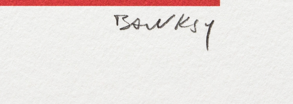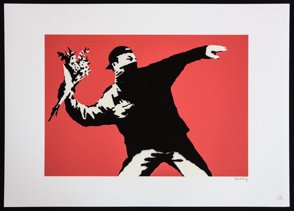Banksy (d'après) "Love Is In The Air" lithographie offset, format feuille 50 x 70 cm, numérotée en bas à droite au crayon, signée, édition limitée 116/150, deux tampons de gaufrage en bas, papier coton, sans documentation supplémentaire, vendu sans cadre ; nous offrons l'expédition interne, si l'acheteur gagne plusieurs articles, nous combinerons l'expédition