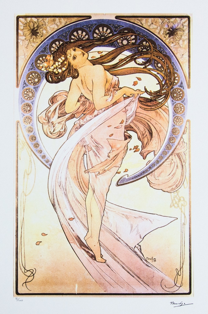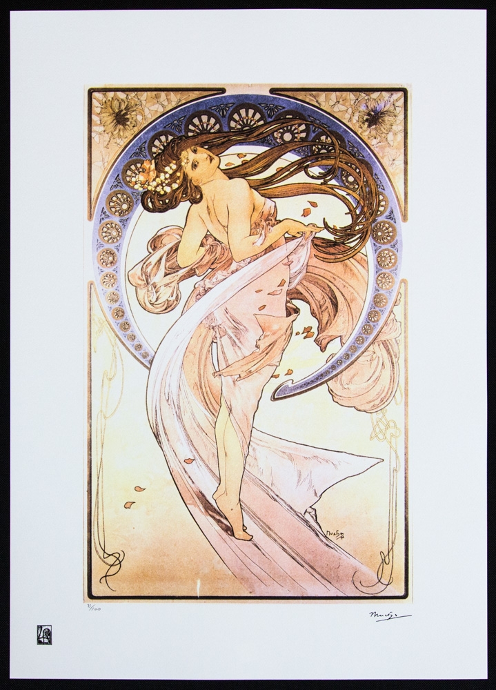 Alphonse Mucha (d'après) "Les Quatre Arts - La Danse" estampe lithographie, format feuille 50 x 70 cm, planche signée en bas à droite, numérotée au crayon en bas à gauche, tirage limité 83/100, cachet de la maison d'édition en bas à gauche "La PLUME, Paris" , papier coton, sans documentation supplémentaire, vendu non encadré ; nous offrons l'expédition interne, si l'acheteur gagne plusieurs articles, nous combinerons l'expédition