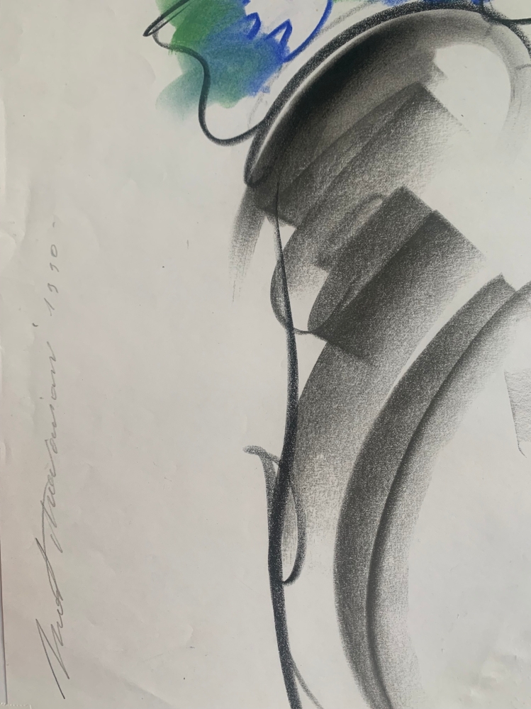 Grand pastel à l'huile sur papier. Dimensions : 59 x 42 cm. A encadrer Signé et daté en bas à gauche par l'artiste. 1990 Henri Matchavariani (né en 1939) est un peintre, calligraphe et illustrateur français d'origine géorgienne et roumaine. Il a été directeur artistique à Paris et Milan. Il réalise de nombreuses illustrations pour la presse (Vogue) et des campagnes publicitaires, notamment pour Air France. Il a travaillé en étroite collaboration avec Helmut Newton sur un projet pour Cacharel. Son art est guidé par l'élégance de la ligne et par un geste de fuite imaginatif, inspiré de l'Orient. Sa calligraphie correspond à celle de Christian Dotremont. Une exposition "Henri Matchavariani et Christian Dotremont" est prévue prochainement. Vers 1990, Henri Matchavariani réalise toute une série de dessins de mode avec des vêtements inspirés de Thierry Mugler. "Seulement quelques coups, par économie, par stricte nécessité pour la planche. Quelques touches comme une lueur de pastel ou d'encre dans l'immobilité de mes draps blancs. Juste quelques coups, et pas plus que ça". Henri Matchavariani Henri Matchavariani est aussi une personnalité du cinéma français : il a réalisé de nombreux doublages, et apparaît régulièrement dans des seconds rôles, notamment dans des films de Philippe Claudel, Roman Polanski, etc. Il partage actuellement la vedette avec Michael Douglas dans le rôle-titre de la série Apple TV : Benjamin Franklin.