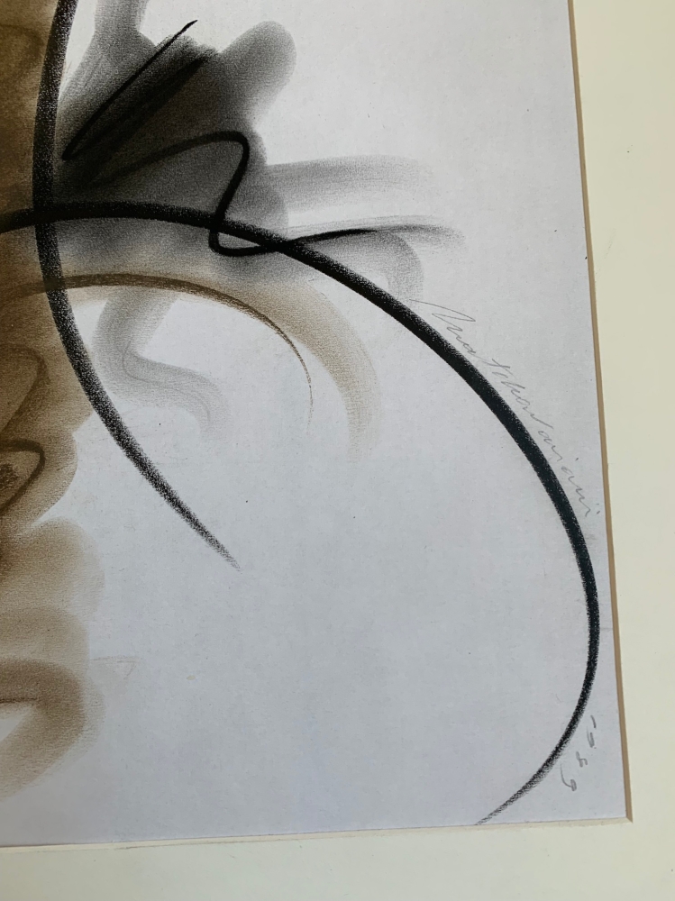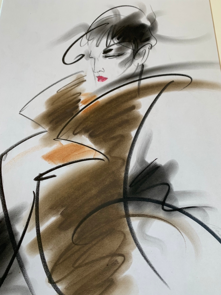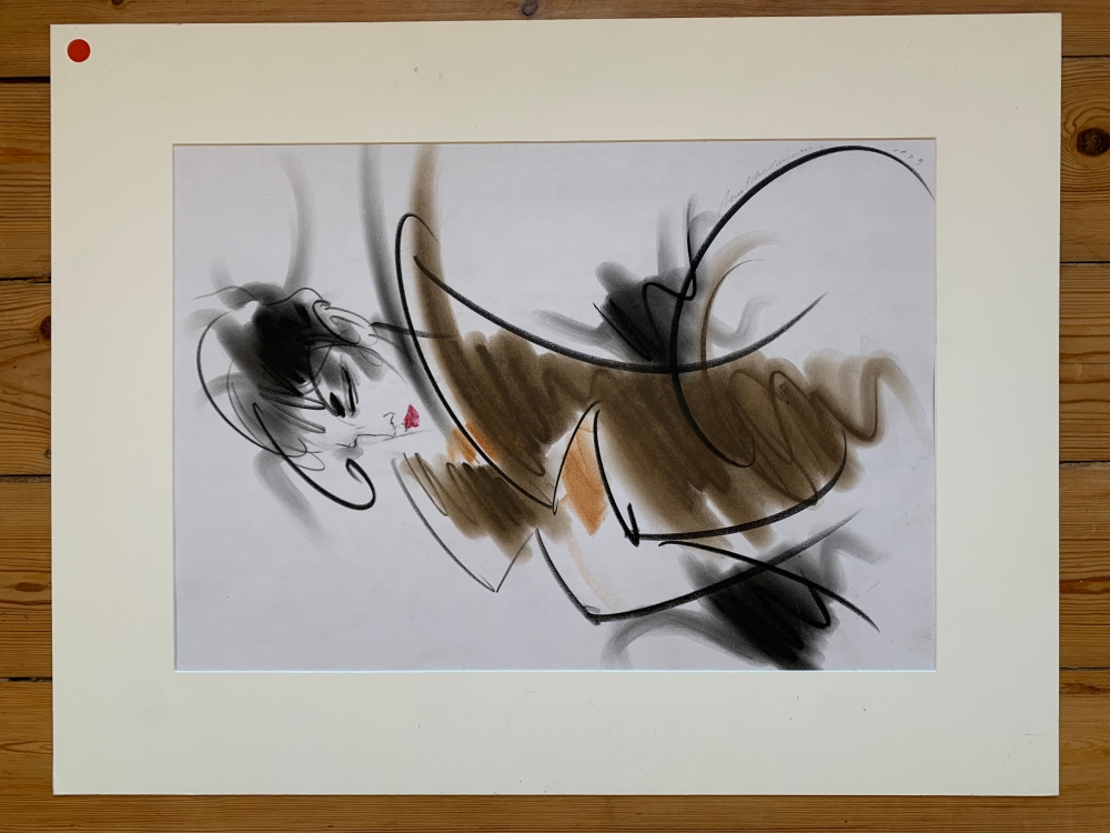 Large oil pastel on paper. Dimensions: 49 x 34 cm and 65 x 50 with passe partout. To be framed. Signed and dated lower right by the artist. 1989 Around 1990, Henri Matchavariani made a whole series of fashion drawings with clothes inspired by Thierry Mugler. Henri Matchavariani (born 1939) is a French painter, calligrapher and illustrator of Georgian and Romanian descent. He was an art director in Paris and Milan. He created numerous illustrations for the press (Vogue) and advertising campaigns, notably for Air France. He worked closely with Helmut Newton on a project for Cacharel. His art is guided by the elegance of line and by an imaginative flight gesture, inspired by the East. His calligraphy corresponds to that of Christian Dotremont. An exhibition "Henri Matchavariani and Christian Dotremont" is planned soon. "Just a few strokes, by thrift, by strict necessity for the sign. Just a few strokes like a vibration of pastel or ink in the silence of my white sheets. Just a few strokes, and no more than that". Henri Matchavariani Henri Matchavariani is also a personality of French cinema: he has realised numerous dubbings, and appears regularly in second roles, notably in films by Philippe Claudel, Roman Polanski, etc. He is currently handing Michael Douglas the title role of the Apple TV series : Benjamin Franklin.
