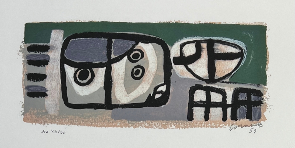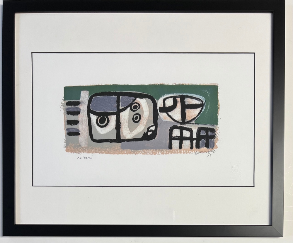 Belle oeuvre Cobra encadrée de Guillaume Corneille signée dans la planche, réalisée en hommage à Charlie Parker :" April in Paris", 1951. Corneille découvre le Jazz à son arrivée à Paris en 1951 dans les cabarets de la Capitale. Avec Hugo Claus, il a l'idée de travailler autour de cette musique. Tirage autorisée à 90 exemplaires d'après la sérigraphie originale "April in Paris" - Schana B Editions / Archives officielles Guillaume Corneille - Tampon au verso de l'image - Pigments naturels sur papier de chanvre Belge. Tirage numéroté. Timbre à sec des éditions Nous vendons ici l'exemplaire numérotée AO 49/90 - Décentrement de l'image imaginée par Corneille suggérant l'arythmie du Jazz. Le peintre a créé en totalité 8 oeuvres dans la série "April in Paris" en 1951. Dimensions avec cadre : 39 x 47 cm Parfait état. Exposition Cobra avec la plus grande collection américaine de Corneille à Miami au printemps et en été 2023. Rétrospective Corneille qui vient de se terminer ce 15 Janvier au Cobra Museum à Amstelveen. Sortie d'un timbre Cobra / Corneille chez Bpost en 2023 Bijoux Corneille exposés à la Fondation Boghossian jusqu'au 14 Mai 2023 (Ornamentum, Collection Diane Venet)
