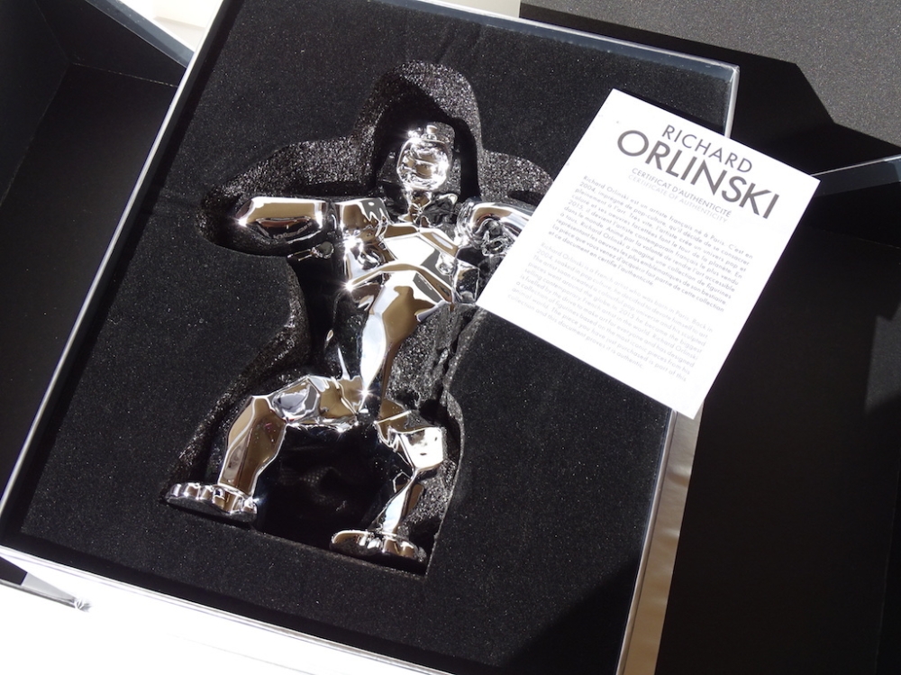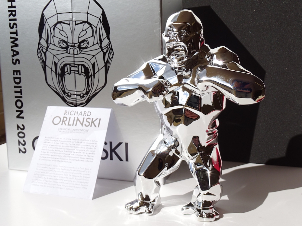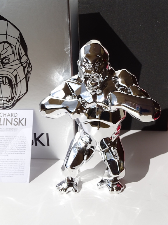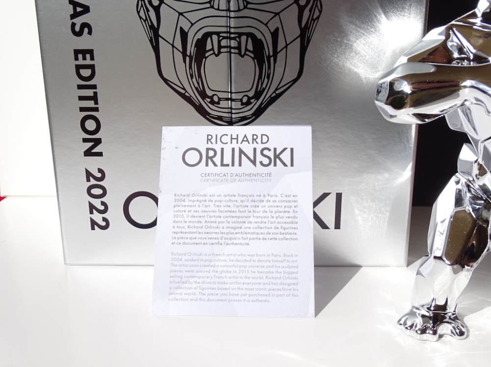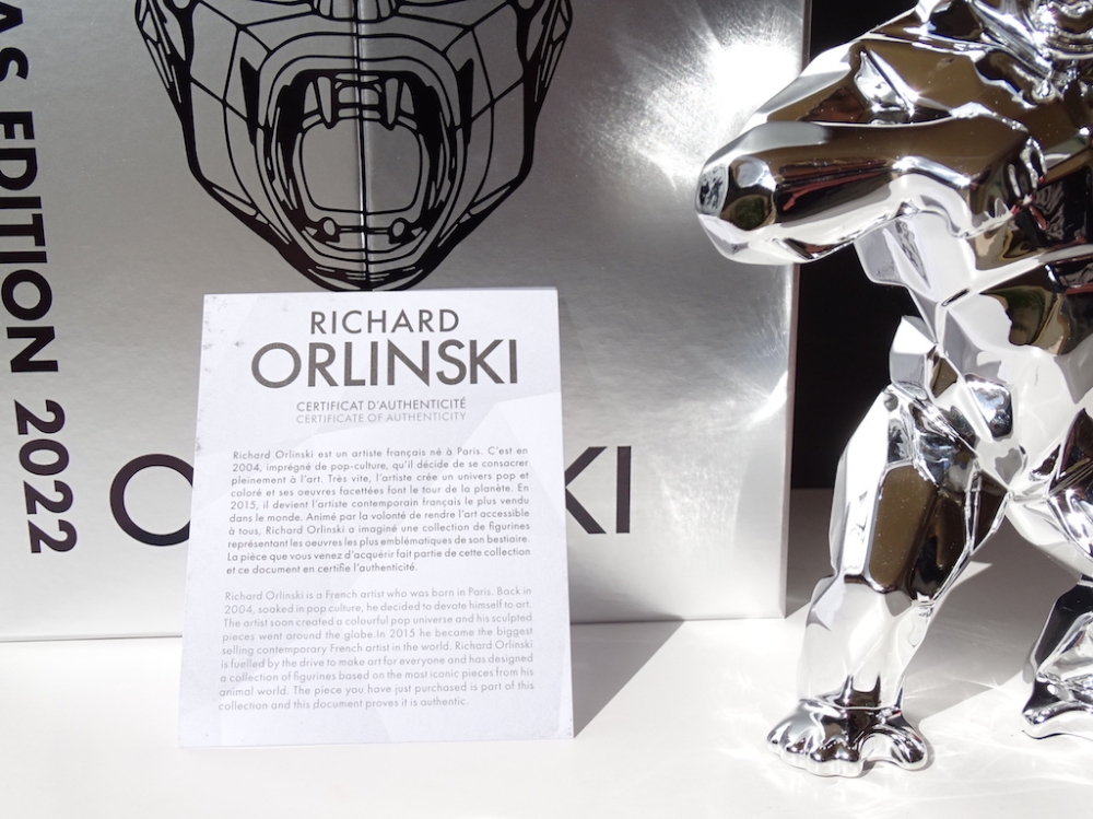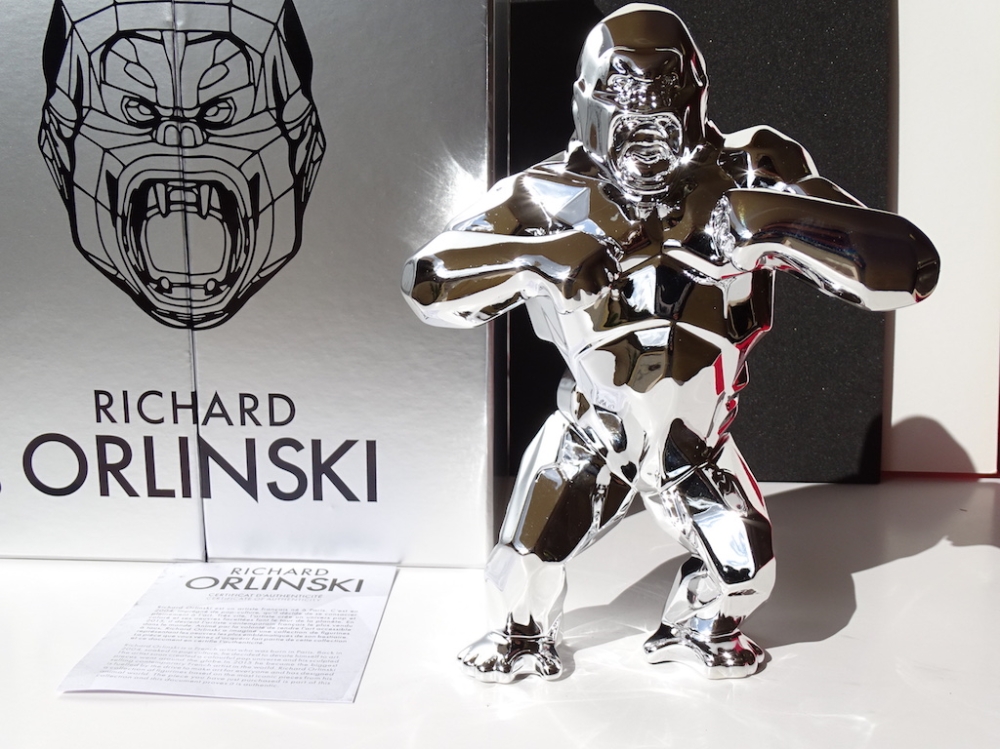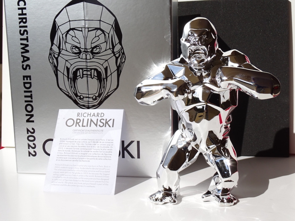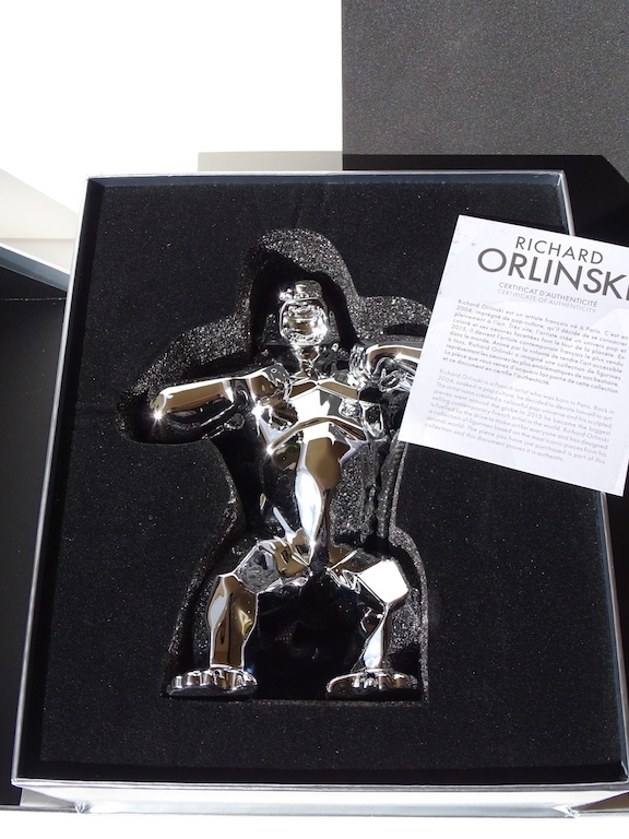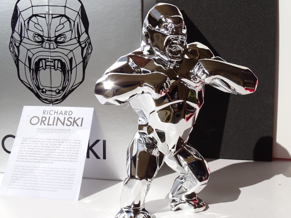 Richard Orlinski avec certificat d'authenticité Je mets aux enchères cette création de Richard Orlinski, artiste contemporain de renommée mondiale. Cette pièce est issue d'une édition (très) limitée, SOLD OUT en quelques minutes. Ce Silver Kong n'a jamais été sorti de son écrin, et est bien entendu remis sous blister, avec sa boite d'origine et son certificat d'authenticité. 19 x 13,5 x 6 cm En parfait état. Richard Orlinski est l'artiste français contemporain le plus vendu au monde et fait partie du cercle très fermé des artistes contemporains comme Koons, Hirst et Cattelan. Ses sculptures, articulées autour du concept Born wild, sont le fruit dune profonde réflexion sur linstinct animal et nature humaine. Curieux de la nature et désireux d'exprimer sa sensibilité à travers d'autres disciplines artistiques, il se découvre une passion pour la musique. Orlinski est une référence en art contemporain au même titre que ses amis et collègues tels que Shepard Fairey (Obey), C215, Jef Aérosol, JR, Swoon, Vhils, Felipe Pantone, Denial, , Banksy, Invader, Basquiat, Hirst, Lichtenstein, M .Chat, Sandra Chevrier, Stik, André Saraiva, Koons, Haring, Imbue, JonOne, Arsham, Stik, M. Brainwash, Kaws, Seth, etc... Envoi mondial suivi soigneusement emballé.