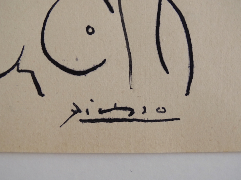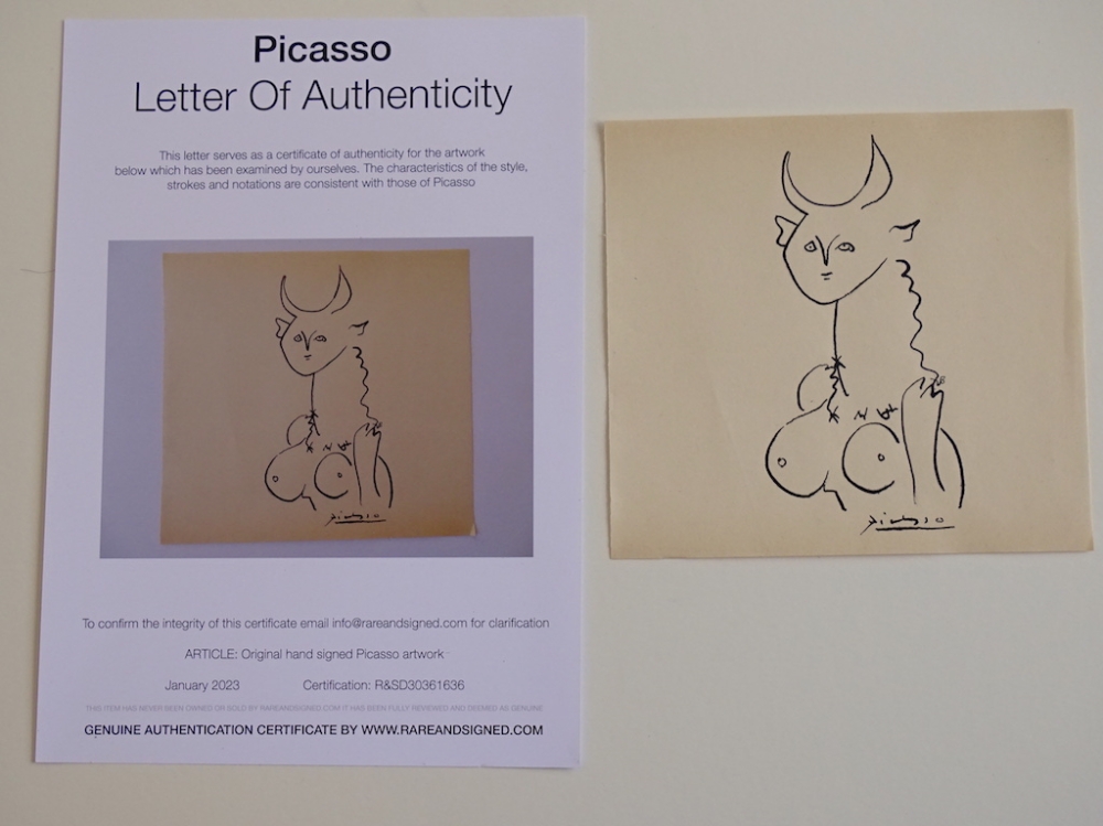 Pablo Picasso (attributed) ink drawing Very good condition Letter of authenticity includedPablo Ruiz Picasso[a][b] (25 October 1881 8 April 1973) was a Spanish painter, sculptor, printmaker, ceramicist and theatre designer who spent most of his adult life in France. Regarded as one of the most influential artists of the 20th century, he is known for co-founding the Cubist movement, the invention of constructed sculpture, the co-invention of collage, and for the wide variety of styles that he helped develop and explore. Among his most famous works are the proto-Cubist Les Demoiselles d'Avignon (1907), and the anti-war painting Guernica (1937), a dramatic portrayal of the bombing of Guernica by German and Italian air forces during the Spanish Civil War.