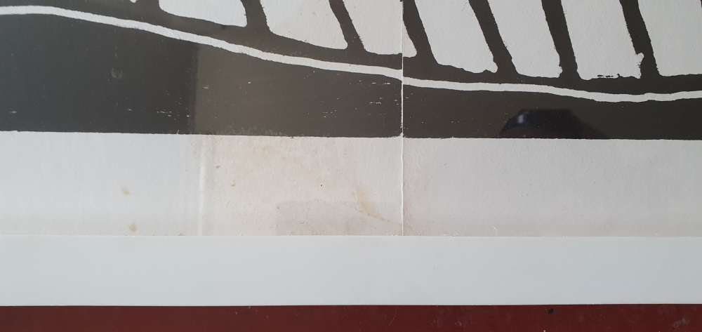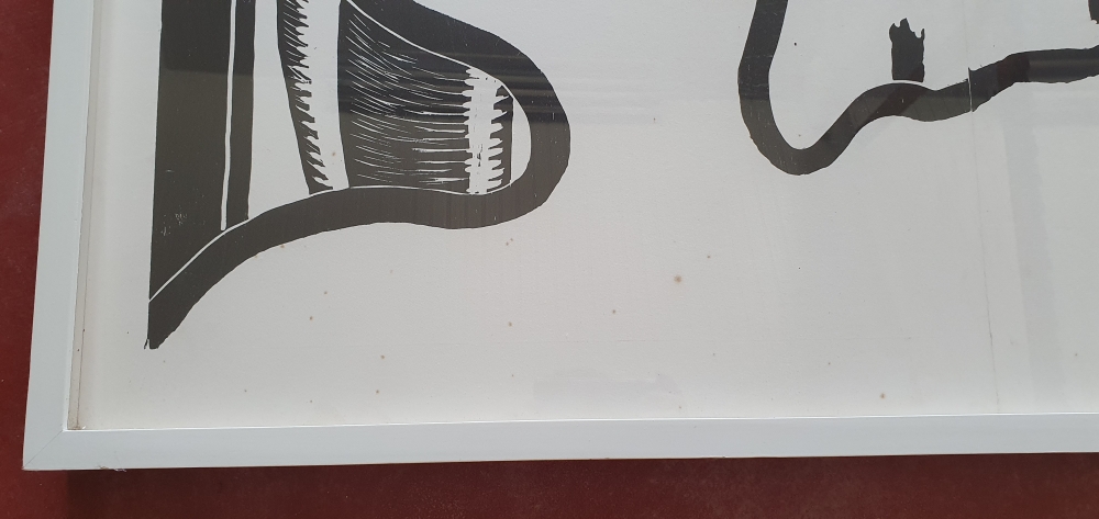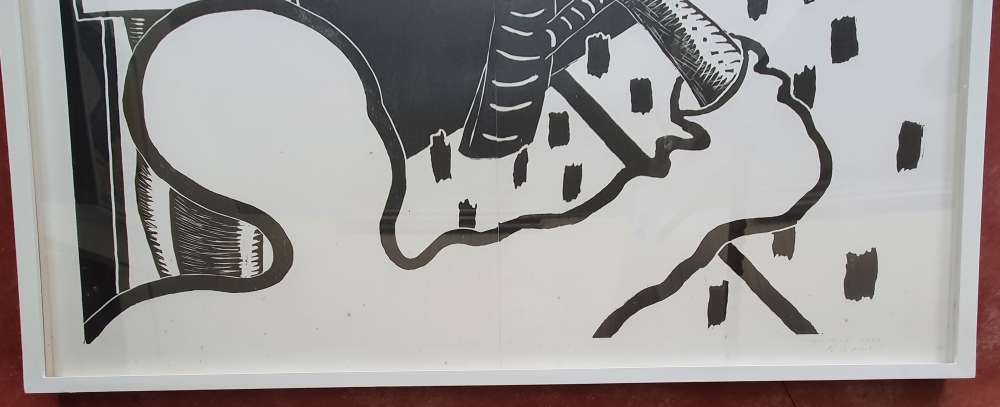 Grande (4 parties) gravure sur bois en noir et blanc dans un cadre. Dimensions gravures sur bois : 1420 x 1020 mm. Dimensions de la lame : 1540 x 1130 mm. L'oeuvre est signée avec la mention 'propre tirage'. L'oeuvre est décrite dans l'oeuvre graphique no. 126 à la page 115. Le prix de la galerie d'un tel travail est facilement de 10 000 euros.