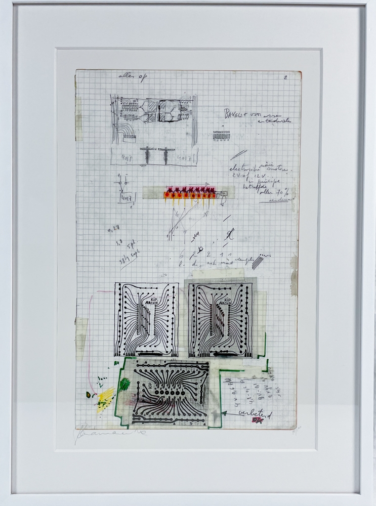 Offset print getekend en genummerd op 100 exemplaren. Dit werk is mooi ingelijst in wit kader met uv-werend glas. Mijn eerste idee was om die kippen volledig zelfsturend te maken, maar het was heel lastig om die twaalf servo's allemaal te programmeren en die stapbeweging perfect op elkaar afgesteld te krijgen. Dit is nochtans nodig want wij zijn ook voorgeprogrammeerd, hé! Als we heel de tijd moeten nadenken bij elke stap die we zetten of bij alles wat we zeggen, dan zou het twee weken duren om een boterham te vragen! Als ge een robot maakt die echt moet functioneren, dan denk ik dat ge nogal rap zult zeggen: ik zal mijn koffieke wel zelf zetten! Maar met die kiekskes verviel dat probleem, want die moeten niks anders doen dan wat rondlopen en gewoon 'kieken zijn' ...