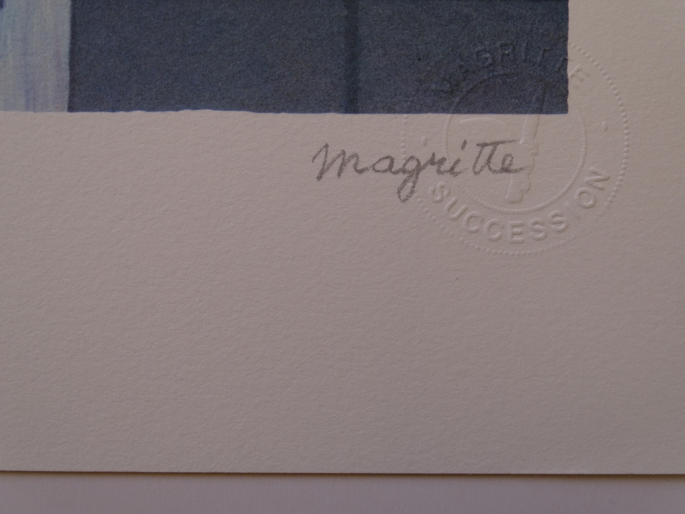 Very beautiful and colorful color lithograph (2010) released by Philippe Moreno's studio with permission and under the control of the ADAGP, which represents the legacy of René Magritte. Magritte's signature is printed. The work has been paragraphed by Charly Herscovici, representative of the Magritte estate. The work is numbered and also contains embossing stamps from the publisher ADAGP and the estate of Magritte. The work has never been framed and is in very good condition. The gallery price for this work is 1000 to 1500 euros.