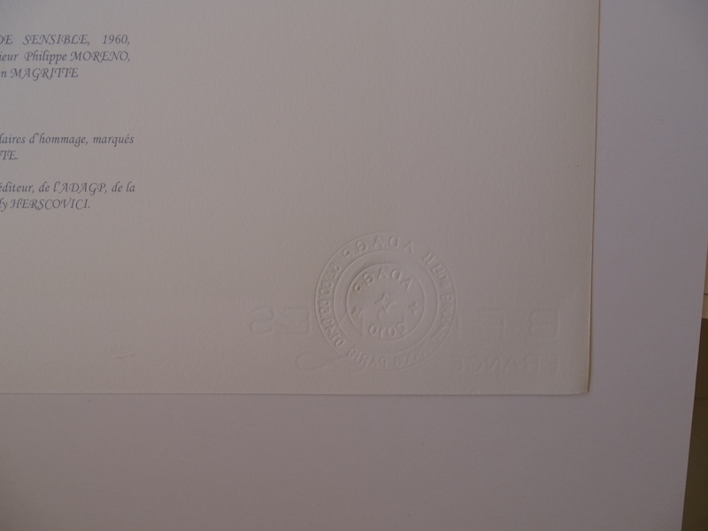 Très belle lithographie colorée et colorée (2010) éditée par l'atelier de Philippe Moreno avec l'autorisation et sous le contrôle de l'ADAGP, qui représente l'héritage de René Magritte. La signature de Magritte est imprimée. L'ouvrage a été paraphé par Charly Herscovici, représentant de la succession Magritte. L'ouvrage est numéroté et contient également des tampons de gaufrage de l'éditeur ADAGP et de la succession de Magritte. L'oeuvre n'a jamais été encadrée et est en très bon état. Le prix galerie pour cette oeuvre est de 1000 à 1500 euros.