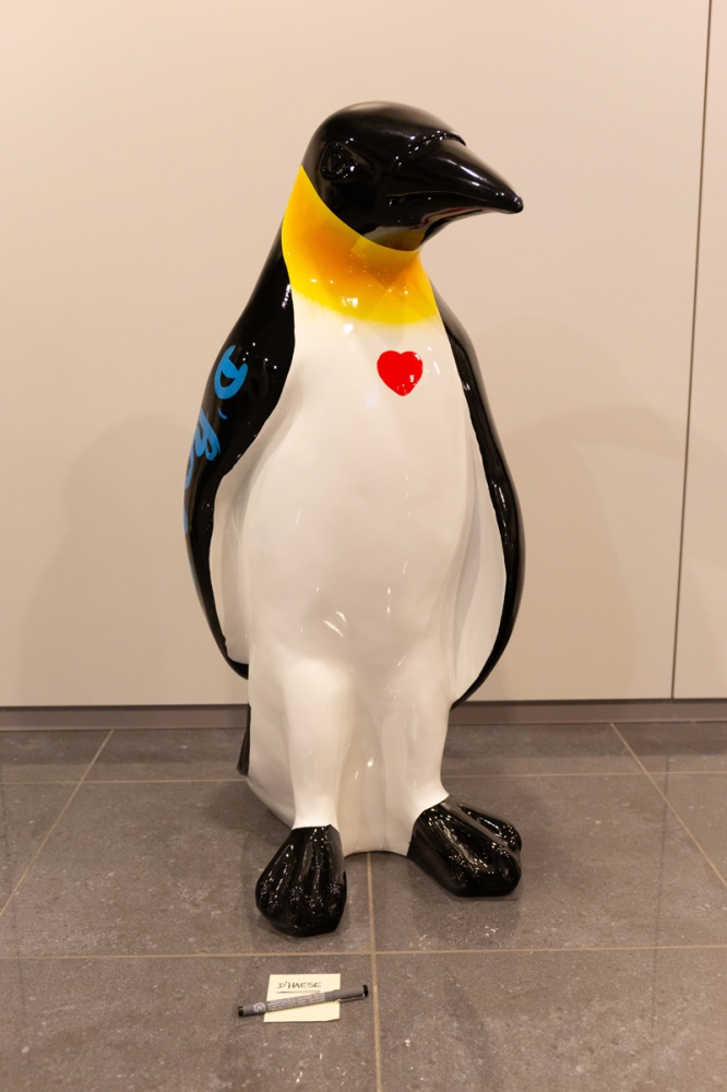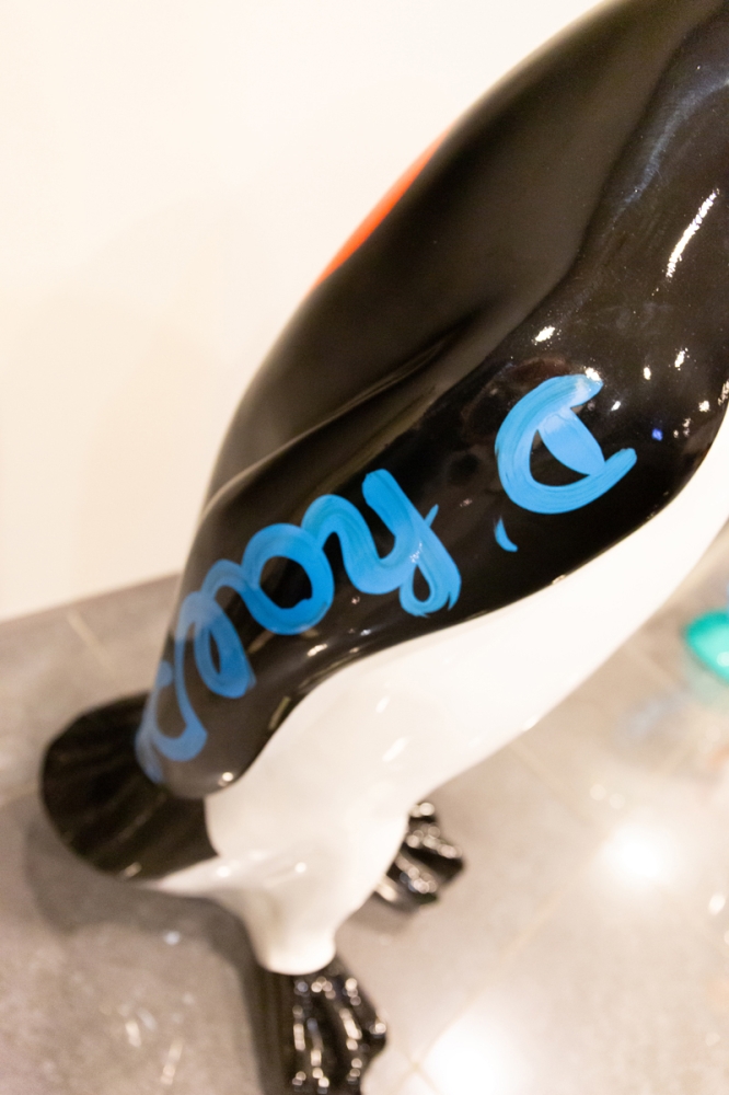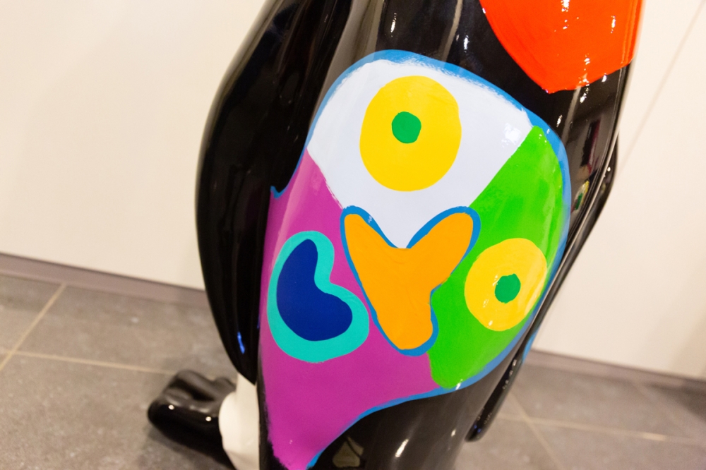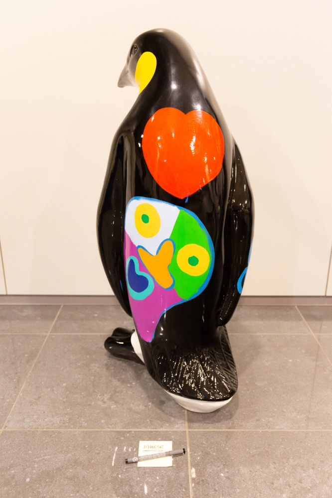 Een sculptuurtje van Hannes D'Haese in de vorm van een pinguin en een originele beschildering van Hannes D'Haese.