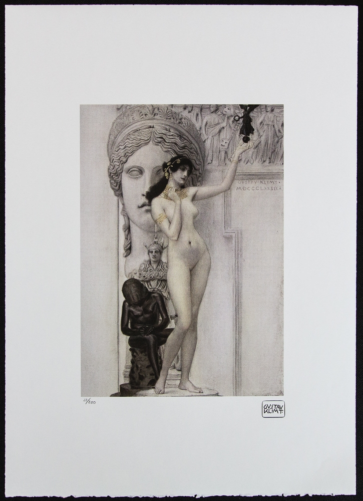 Gustav Klimt (after) "Allegory Of Sculpture" limited edition of 200, offset lithography, plate signed bottom right, numbered with pencil bottom left 22/200, fine art paper, with La TREC Spa embossing, sheet size: 50 x 70cm, without additional dicumentation, sold unframed; we offer in-house shipping, if the buyer win multiple items, we will combine shipping