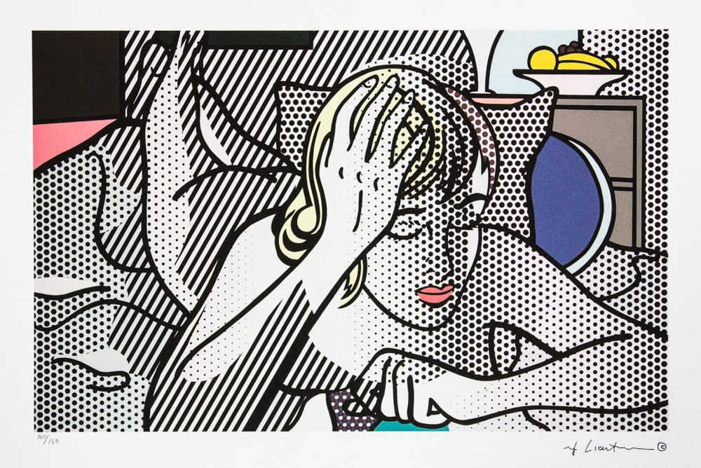 Roy Lichtenstein (d'après) "Thinking Nude" édition limitée à 150, lithographie offset, planche signée en bas à droite, numérotée au crayon en bas à gauche 100/150, papier fort, avec gaufrage "STYRIA Studio" "Tampon CASTELLI Graphics" au dos, format feuille 35 x 50cm, sans documentation supplémentaire, vendu sans cadre; nous offrons l'expédition interne, si l'acheteur gagne plusieurs articles, nous combinerons l'expédition