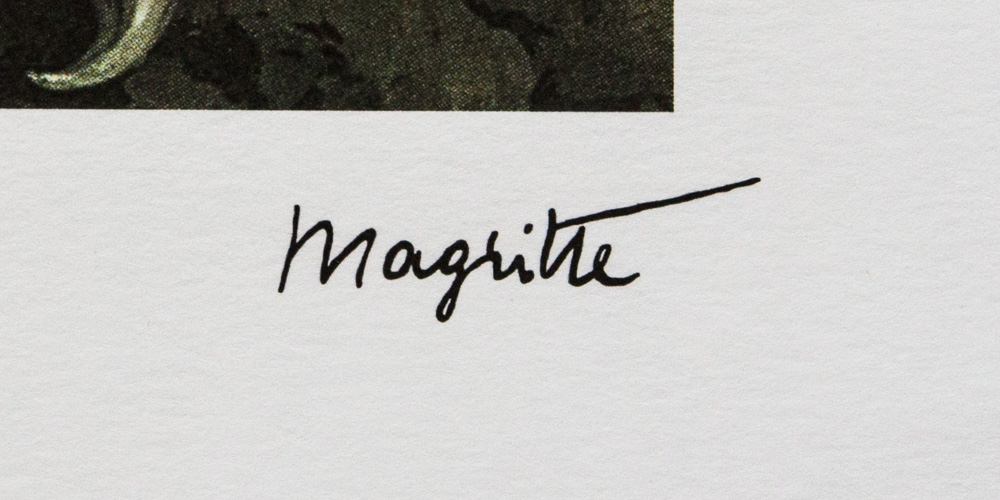 René Magritte (d'après) Lithographie offset "Le Présent", édition limitée à 100 exemplaires, planche signée en bas à droite, numérotée au crayon en bas à gauche 20/100, cachet de la maison d'édition en bas à gauche "SPADEM, Paris", papier d'art, format feuille : 50 x 70cm, sans documentation supplémentaire, vendu non encadré ; nous offrons l'expédition interne, si l'acheteur gagne plusieurs articles, nous combinerons l'expédition
